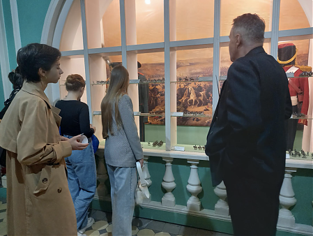 Хрусталев С.А. занимается изготовлением и составлением композиций из фигурок нюрнбергского стандарта (нюрнбергская миниатюра). В области исторической военной реконструкции создал значительное количество точных копий предметов и снаряжения эпохи наполеоновских и первой мировой войн. Студенты ознакомились не только с экспозицией живописных работ Хрусталева С.А., но и с выставкой точных копий расписных оловянных солдатиков. Эта выставка посвящена 21 годовщине Бородинского сражения. Сергей Алексеевич рассказал о малоизвестных широкой публике эпизодах знаменитой битвы 1812 года, о технологии изготовления фигурок в аутентичном образе соответствующем исторической достоверности.