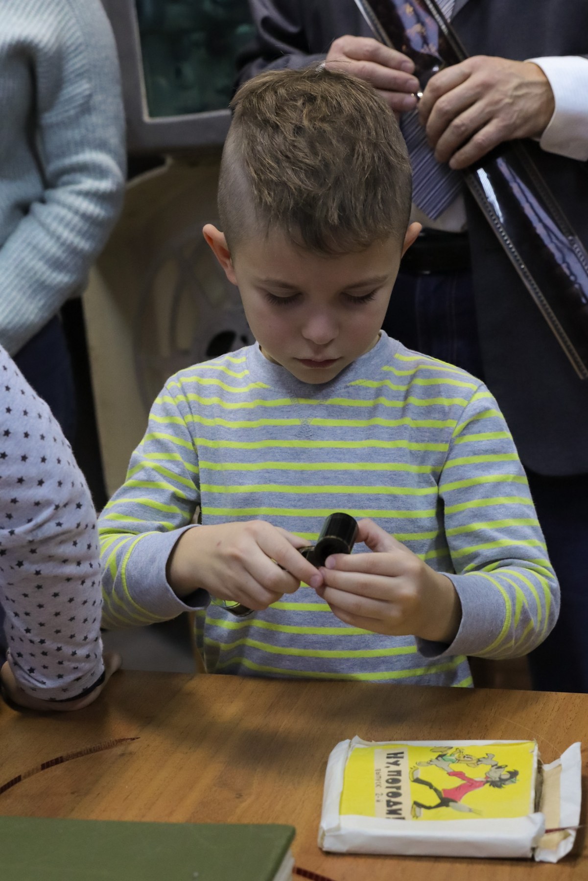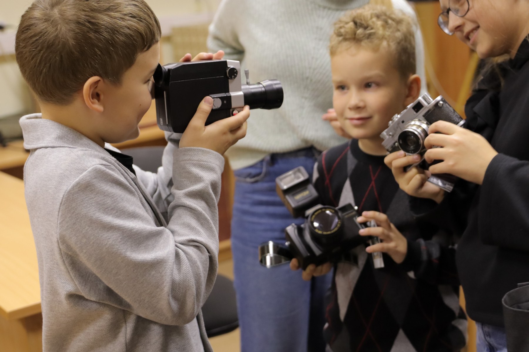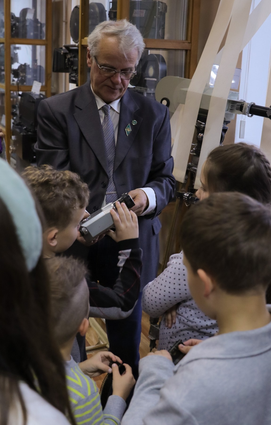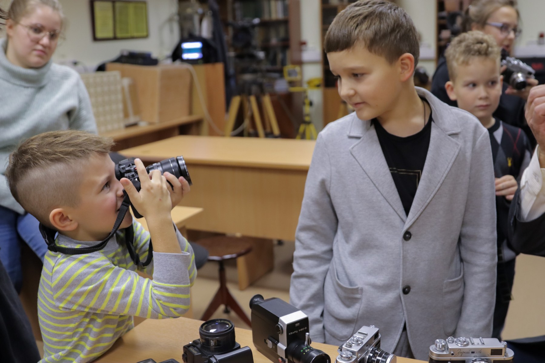 С огромным интересом маленькие «киношники» осмотрели и «потрогали» экспонаты музея отечественной кинотехники, а затем, плавно переместившись в лабораторию фототехники, под руководством старшего преподавателя кафедры Константина Кимовича Гудинова прошли мастер-класс по ознакомлению с любительской кино- и фототехникой: примерили на себя роль фотографов прошлого столетия и научились пользоваться современным фотоаппаратом моментальной фотографии. Особый восторг детей вызвала самостоятельная демонстрация серии мультфильма «Ну, погоди!» на узкоплёночном кинопроекторе.