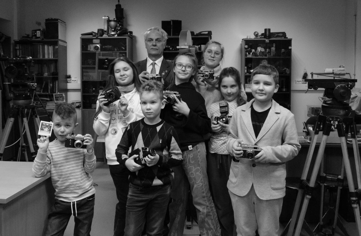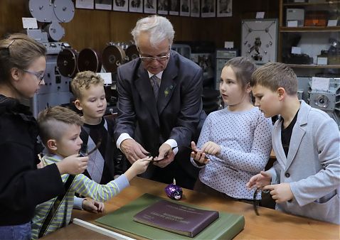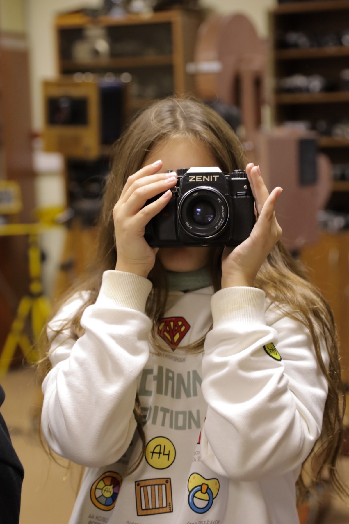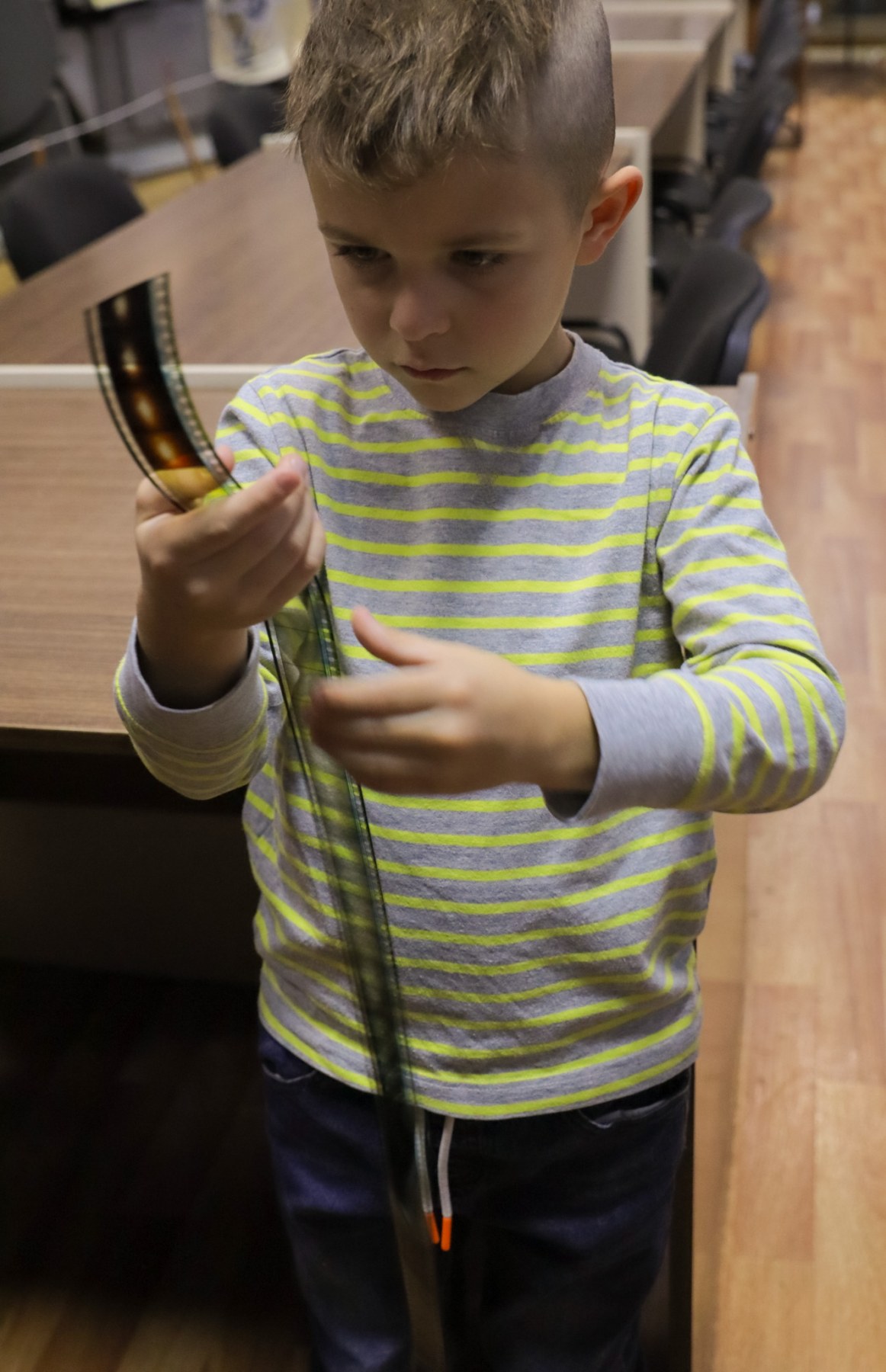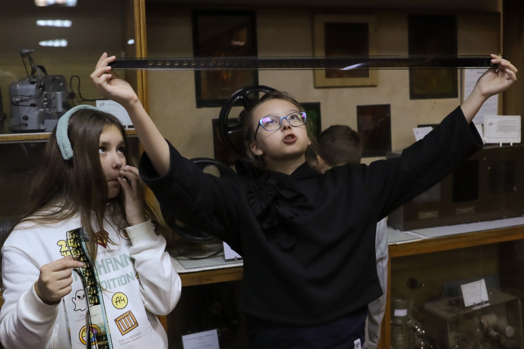 С огромным интересом маленькие «киношники» осмотрели и «потрогали» экспонаты музея отечественной кинотехники, а затем, плавно переместившись в лабораторию фототехники, под руководством старшего преподавателя кафедры Константина Кимовича Гудинова прошли мастер-класс по ознакомлению с любительской кино- и фототехникой: примерили на себя роль фотографов прошлого столетия и научились пользоваться современным фотоаппаратом моментальной фотографии. Особый восторг детей вызвала самостоятельная демонстрация серии мультфильма «Ну, погоди!» на узкоплёночном кинопроекторе.