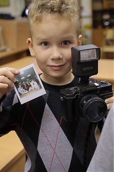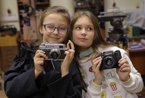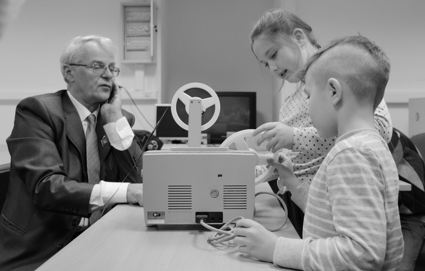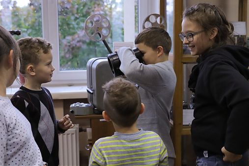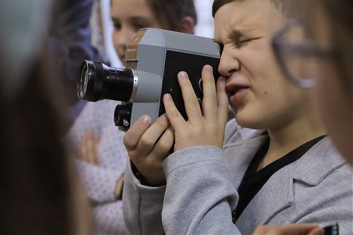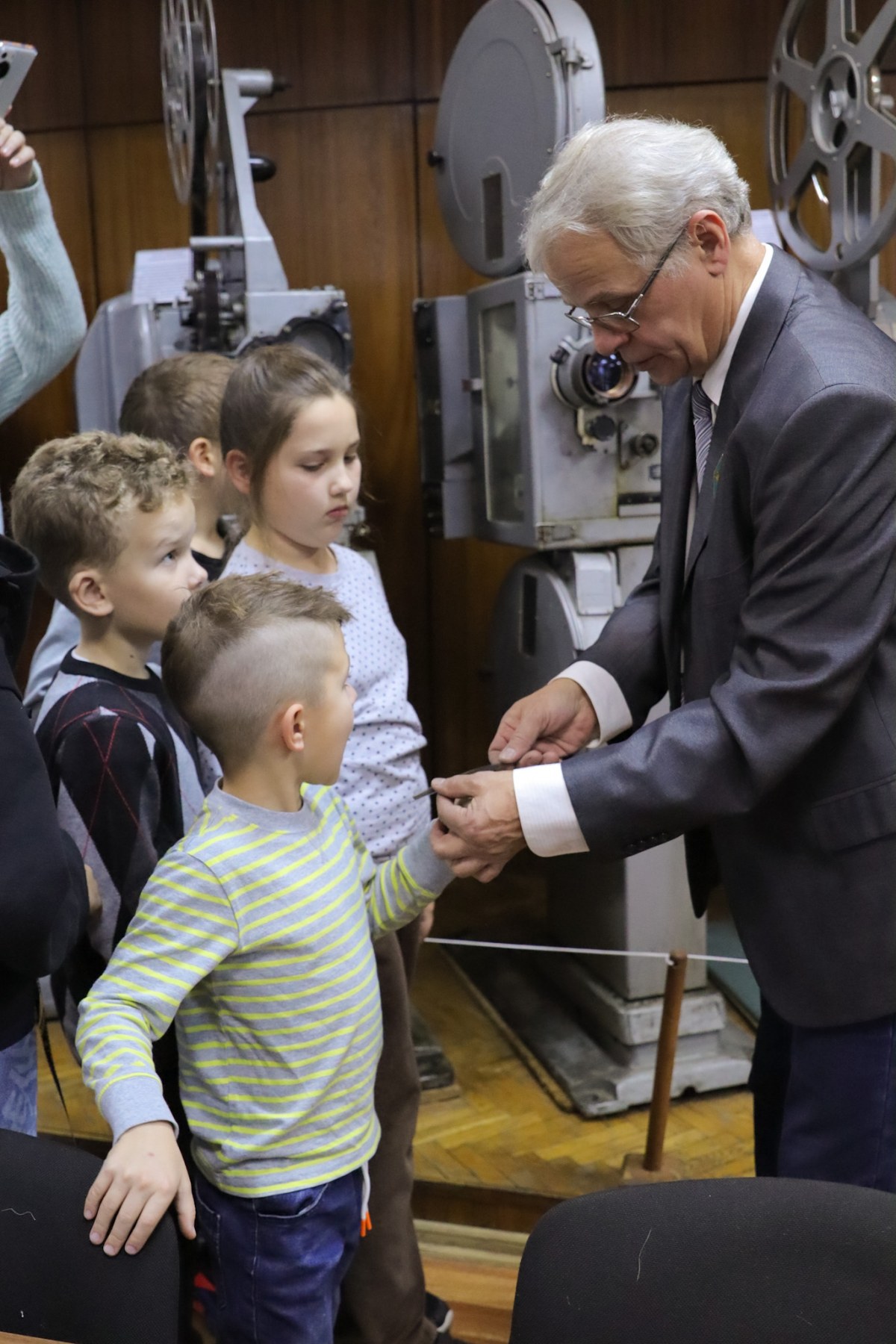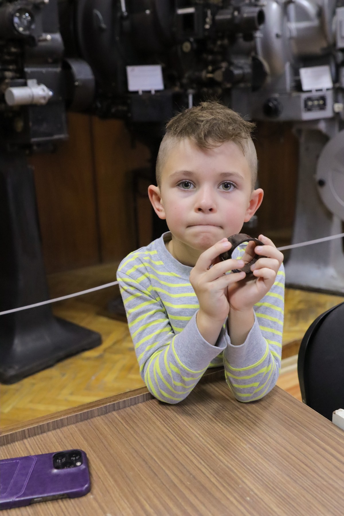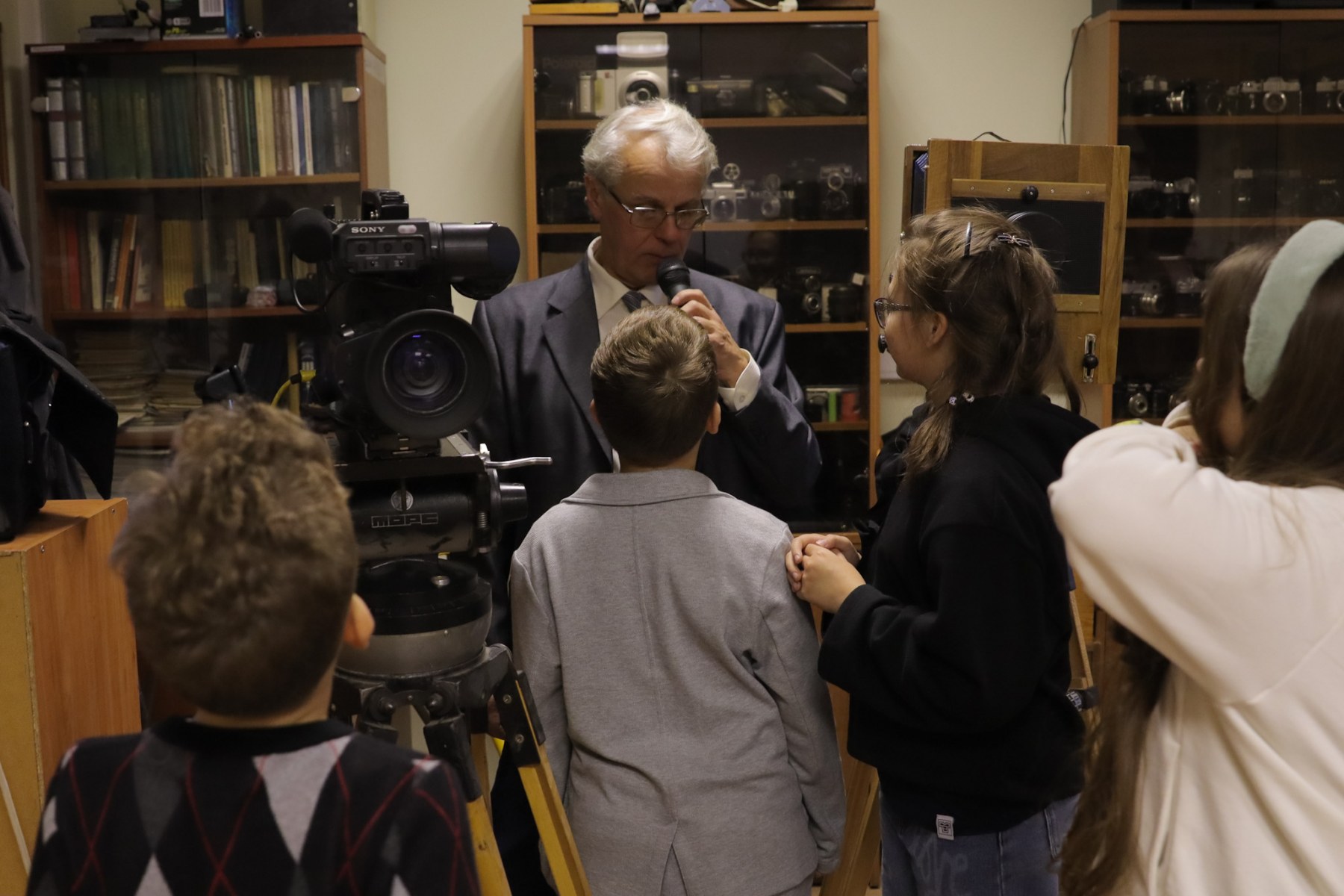 С огромным интересом маленькие «киношники» осмотрели и «потрогали» экспонаты музея отечественной кинотехники, а затем, плавно переместившись в лабораторию фототехники, под руководством старшего преподавателя кафедры Константина Кимовича Гудинова прошли мастер-класс по ознакомлению с любительской кино- и фототехникой: примерили на себя роль фотографов прошлого столетия и научились пользоваться современным фотоаппаратом моментальной фотографии. Особый восторг детей вызвала самостоятельная демонстрация серии мультфильма «Ну, погоди!» на узкоплёночном кинопроекторе.