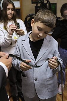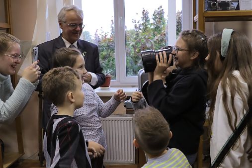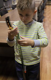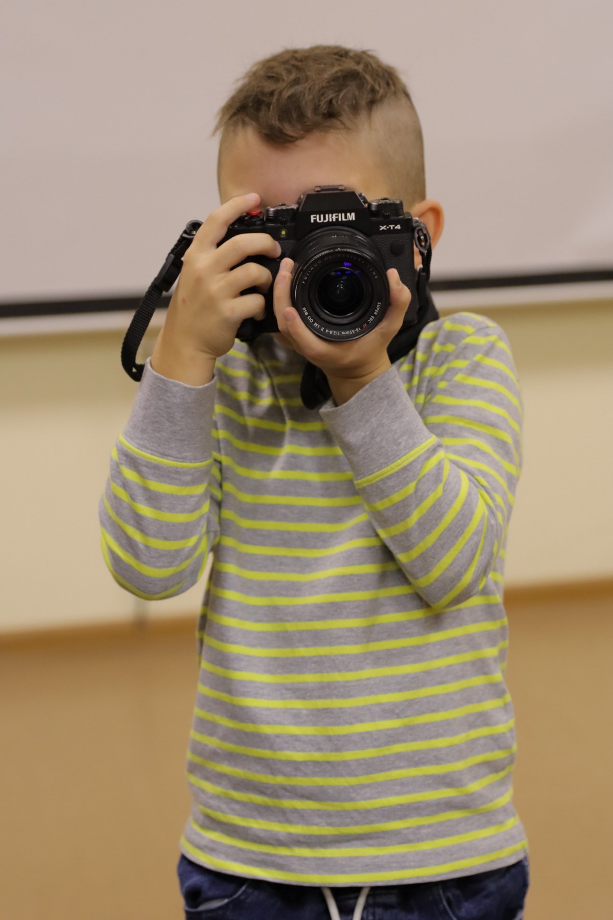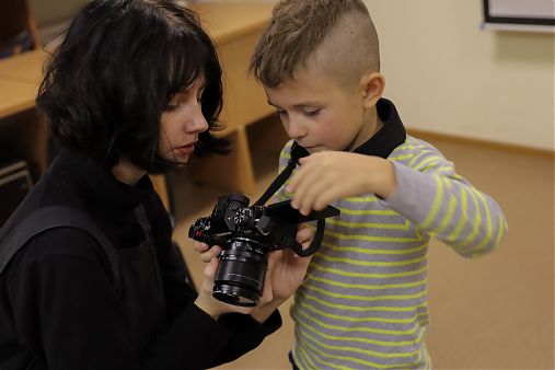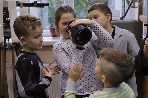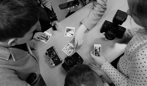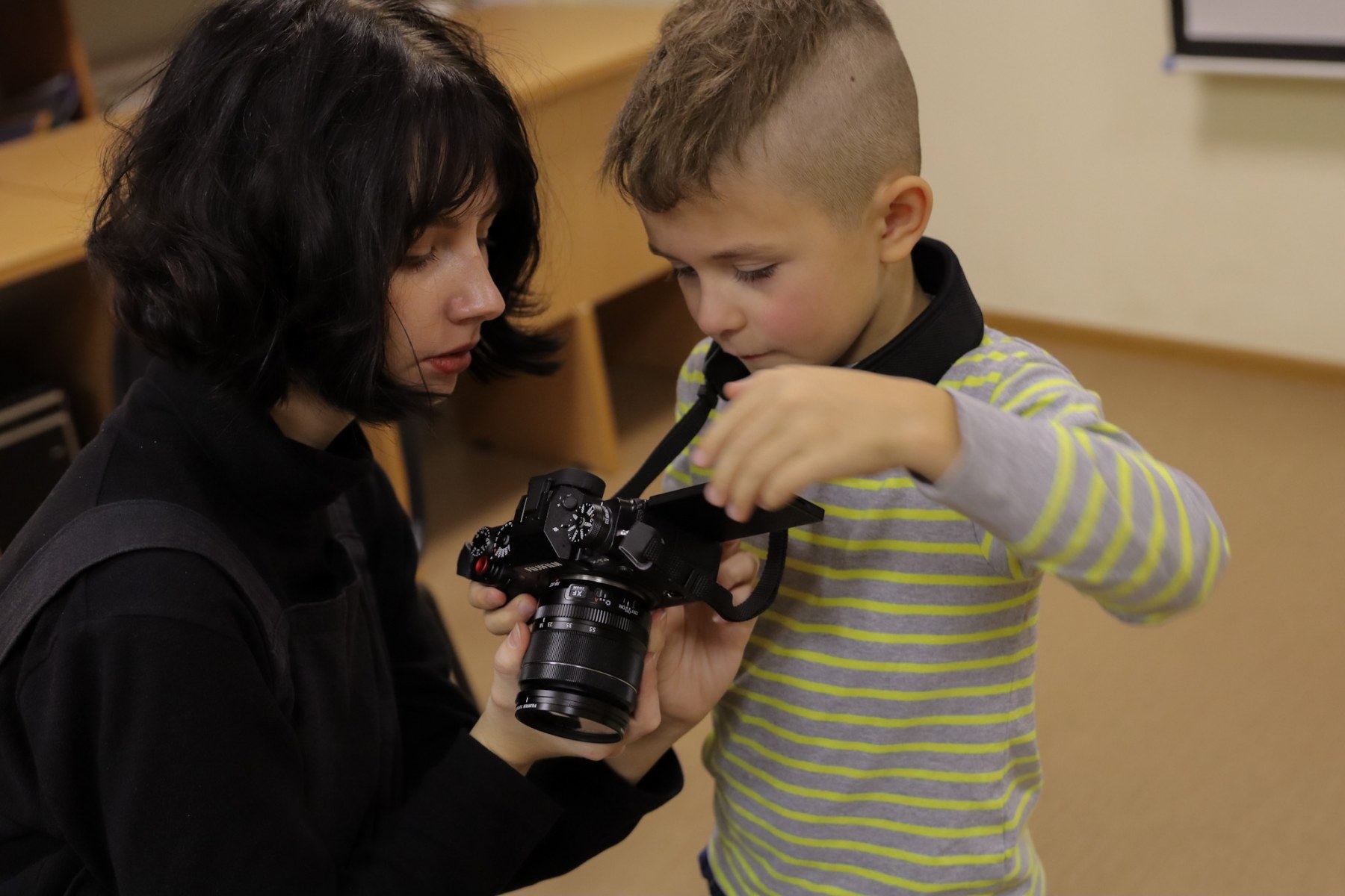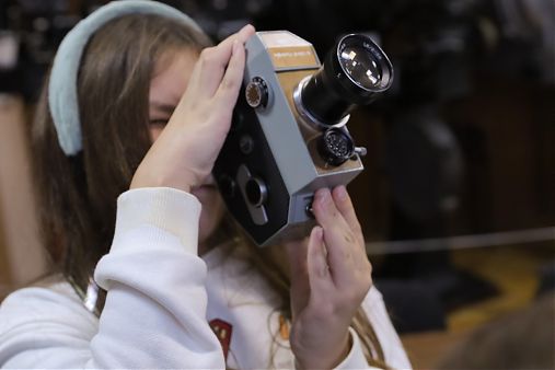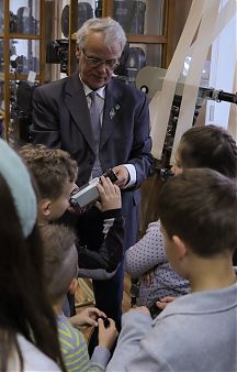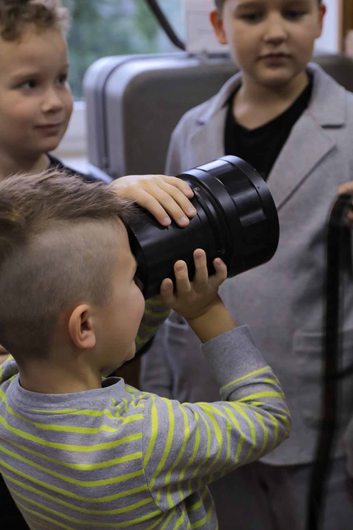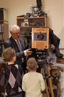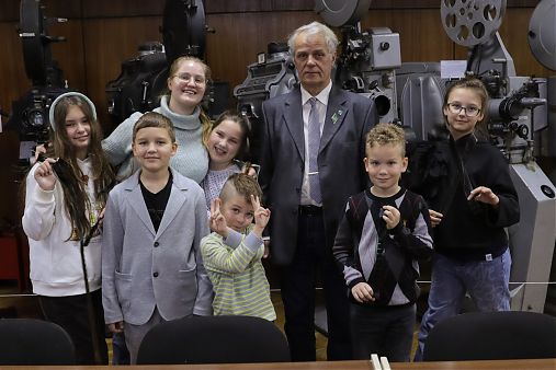 С огромным интересом маленькие «киношники» осмотрели и «потрогали» экспонаты музея отечественной кинотехники, а затем, плавно переместившись в лабораторию фототехники, под руководством старшего преподавателя кафедры Константина Кимовича Гудинова прошли мастер-класс по ознакомлению с любительской кино- и фототехникой: примерили на себя роль фотографов прошлого столетия и научились пользоваться современным фотоаппаратом моментальной фотографии. Особый восторг детей вызвала самостоятельная демонстрация серии мультфильма «Ну, погоди!» на узкоплёночном кинопроекторе.