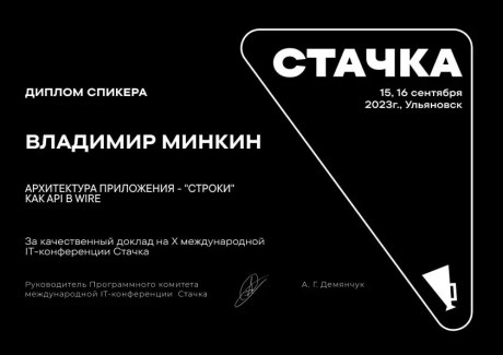 15 сентября преподаватель кафедры режиссуры цифровых медиа - Владимир Сергеевич Минкин выступил с докладом о идеи использования строчных констант для вызова операций внутри программы и между еë компонентами, и разделения программных компонентов на независимые модули, которые могут получать динамические данные, также, на основе строковых констант - "Строки как API программной системы". Идея реализована в библиотеке Wire на языках Dart и TypeScript, OpenSource.