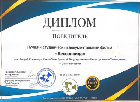 Фильм Андрея Ковальчука «Бессонница» был признан «Лучшим студенческим документальным фильмом».