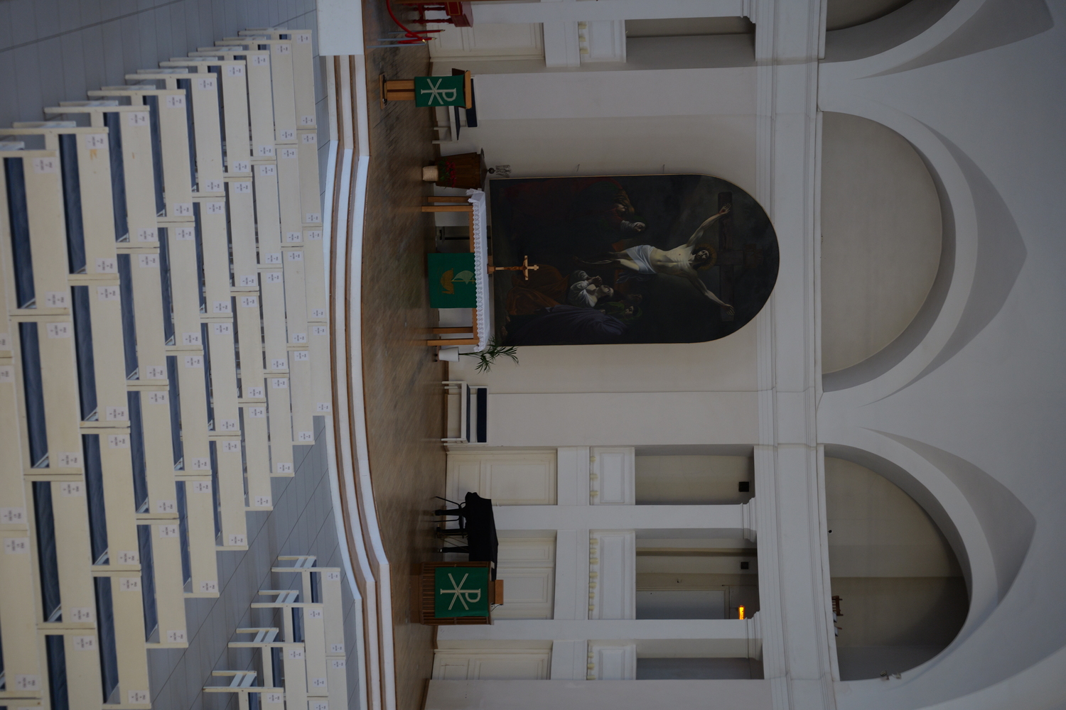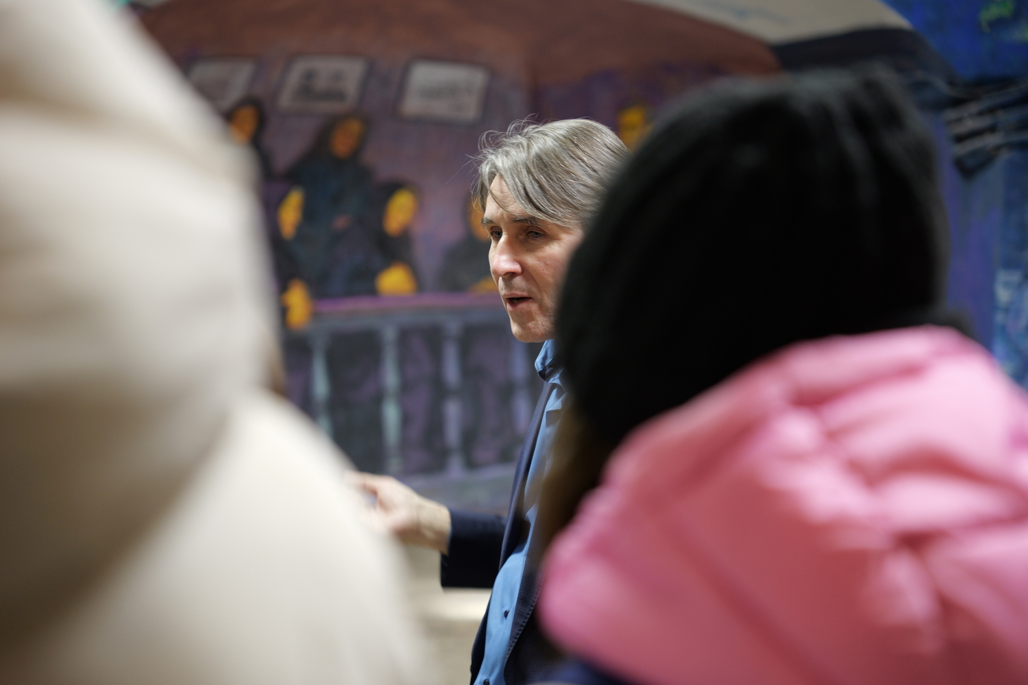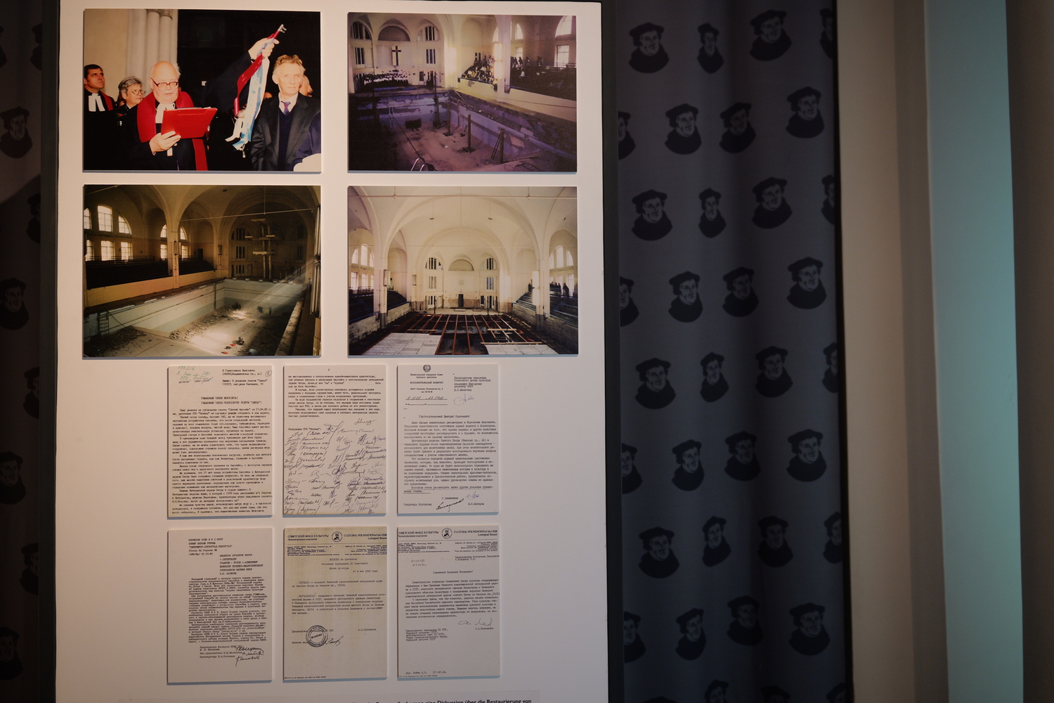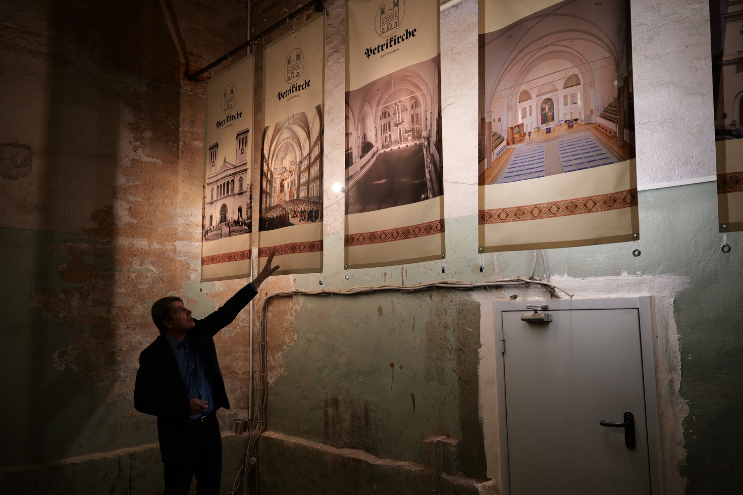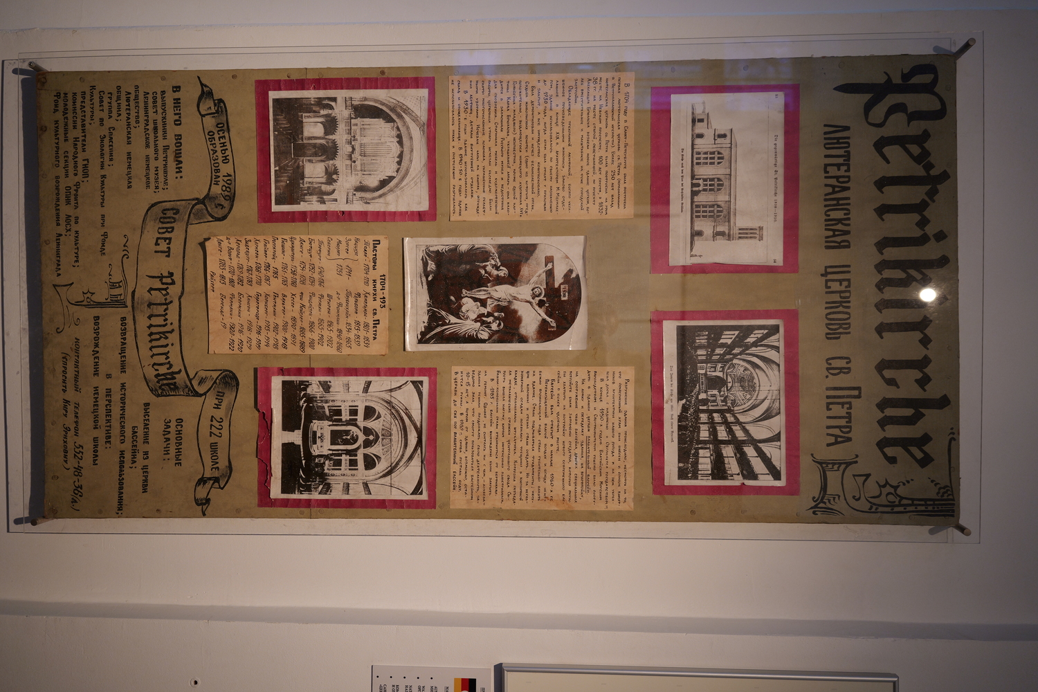 Далее, мы прошли в церковной зал, который находятся на третьем этаже. Он очень просторный и завораживающий. В зале стоят два органа – большой и малый. Их звучание очень красивое. Во второй половине 20-го века зал использовался как бассейн, кафельный пол сохранился до сих пор. Затем мы посетили восточную башню с видом на Невский проспект, ангела Петрикирхе и окружающие здания. В башне имеется колокольный механизм. Колокола звонят каждый 15 минут и каждый час. В конце экскурсии мы спустились на самое дно – катакомбы Петрикирхе, где находится оставшаяся чаша бассейна. Там мы увидели картины русского художника, посвященные жертвам репрессий и депортации, и декорации снаружи бассейна с красочными рисунками на тему веры, любви и надежды, выполненные американским художником. Думаю, их работы впечатлили меня больше всего. Сейчас там же проходит выставка современного искусства российской художницы, посвященная единству человека и природы.