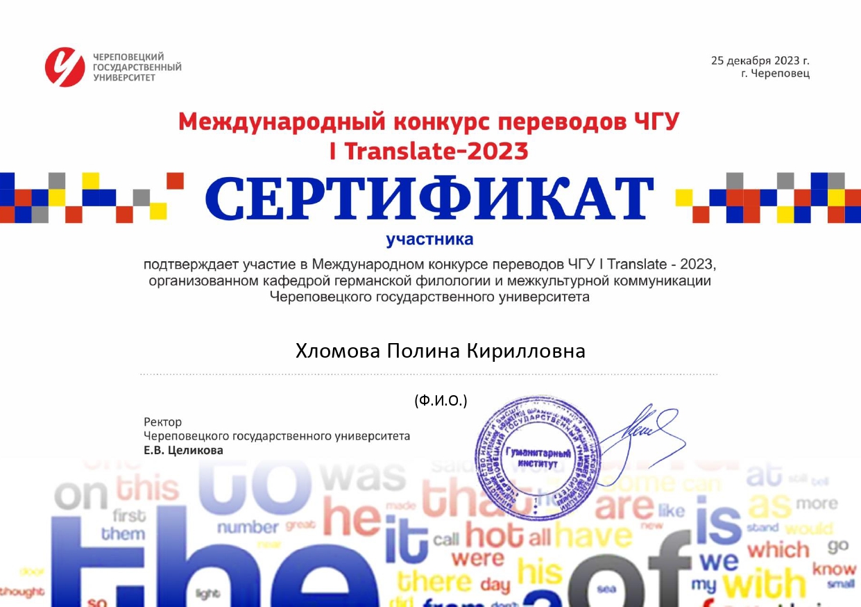 Студенты ГИКиТ приняли участие в заочном «Международном Конкурсе переводов ЧГУ I Translate – 2023», проходившем с 15 ноября по 5 декабря 2023 г, который проводила кафедра германской филологии и межкультурной коммуникации Череповецкого государственного университета.