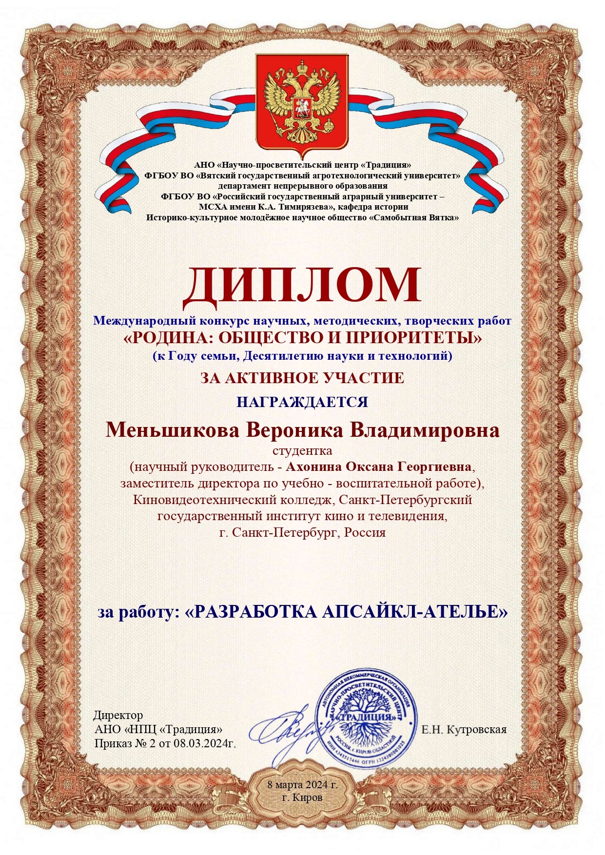 Студентка Киновидеотехнического колледжа приняла участие в Международном конкурсе научных, методических, творческих работ «РОДИНА: ОБЩЕСТВО И ПРИОРИТЕТЫ» (к Году семьи, Десятилетию науки и технологий).