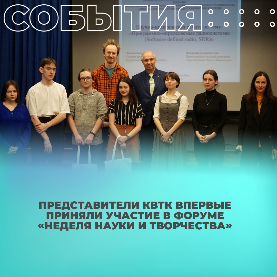 С 8 по 13 апреля в Санкт-Петербургском государственном институте кино и телевидения проходил Международный форум «Неделя науки и творчества-2024». Представители КВТК успешно представили колледж на форуме и заняли призовые места.