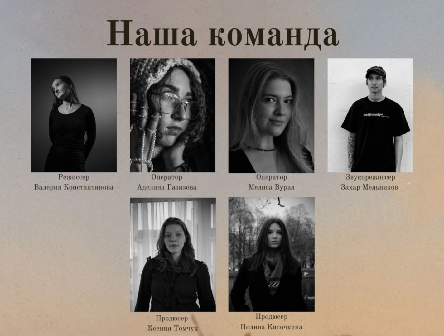 В состав съемочной группы вошли: Валерия Константинова – режиссер и автор, мастерская В.Е. Васильева, Аделина Газизова – оператор, мастерская Николая Васильевича Волкова, Сергея Михайловича Ландо, Ивана Андреевича Турухано, Вурал Мелиса – оператор, мастерская Н.В.Волкова, С.М.Ландо, И.А.Турухано, Томчук Ксения – продюсер, мастерская В.Ю.Карева, Кисочкина Полина – продюсер, мастерская В.Ю.Карева, Мельников Захар – звукорежиссер, мастерская М.М.Шейнман и В.М.Персова.