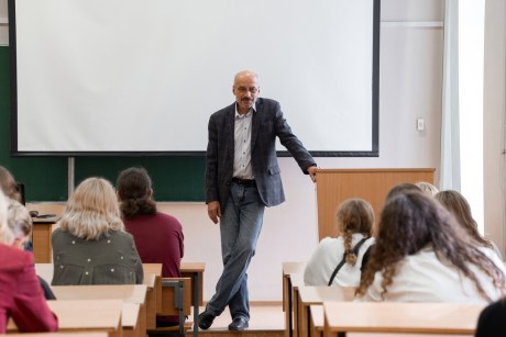 Заведующий кафедрой неигрового кино ГИКИТ Виктор Васильев и почетный гость мастер-класса советский и российский кинорежиссёр Сергей Дебижев поделился опытом с молодыми кинематографистами, мечтающими снимать документальное кино о России.