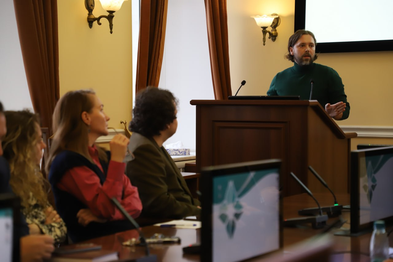 Доцент кафедры драматургии и киноведения Анна Ганшина выступила с докладом об особенностях работы по теме СВО и новых территорий РФ в документальном и игровом кинематографе. Доклад был построен на примере фильмов, где Анна была сценаристом — «Река героев» и «Вопреки войне».