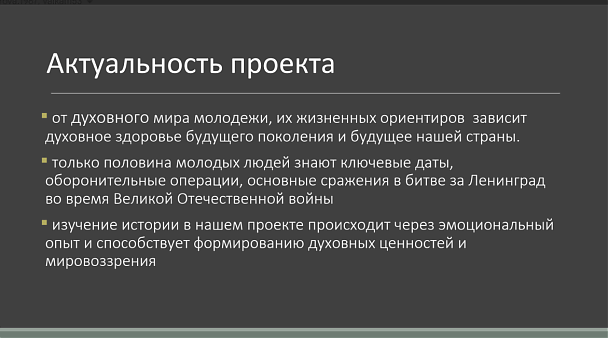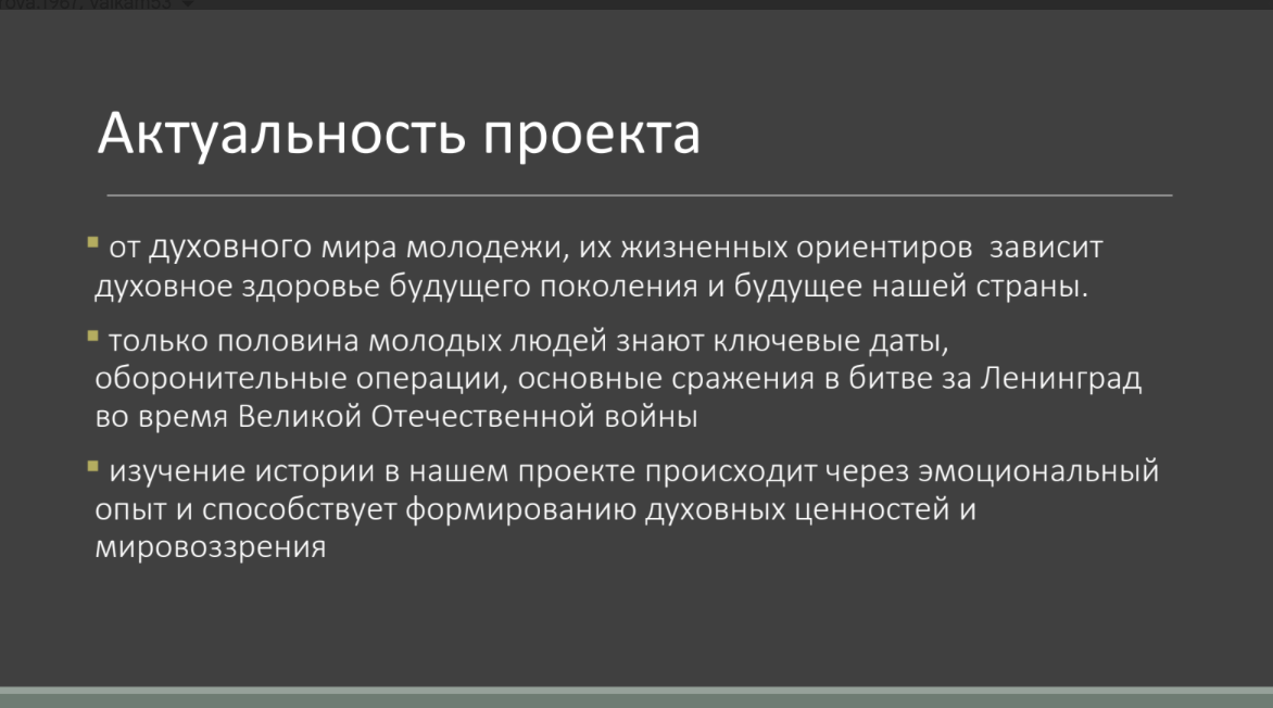 В настоящее время, данный проект подан к участию в номинации "Лучший проект по сохранению памяти об участниках Великой Отечественной войны 1941-1945 годов" Всероссийской премии в сфере исторического просвещения молодёжи "Голос истории". "Голос истории" — это первый в России масштабный проект, призванный найти и поддержать тех, кто говорит с молодежью на языке истории ярко, современно и убедительно. Организаторы стремятся выявить лучшие практики, инновационные проекты и смелые идеи, которые превращают изучение прошлого в увлекательное путешествие, в творческий процесс и в личное открытие.