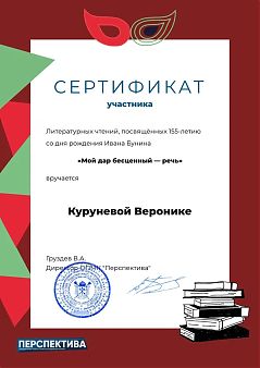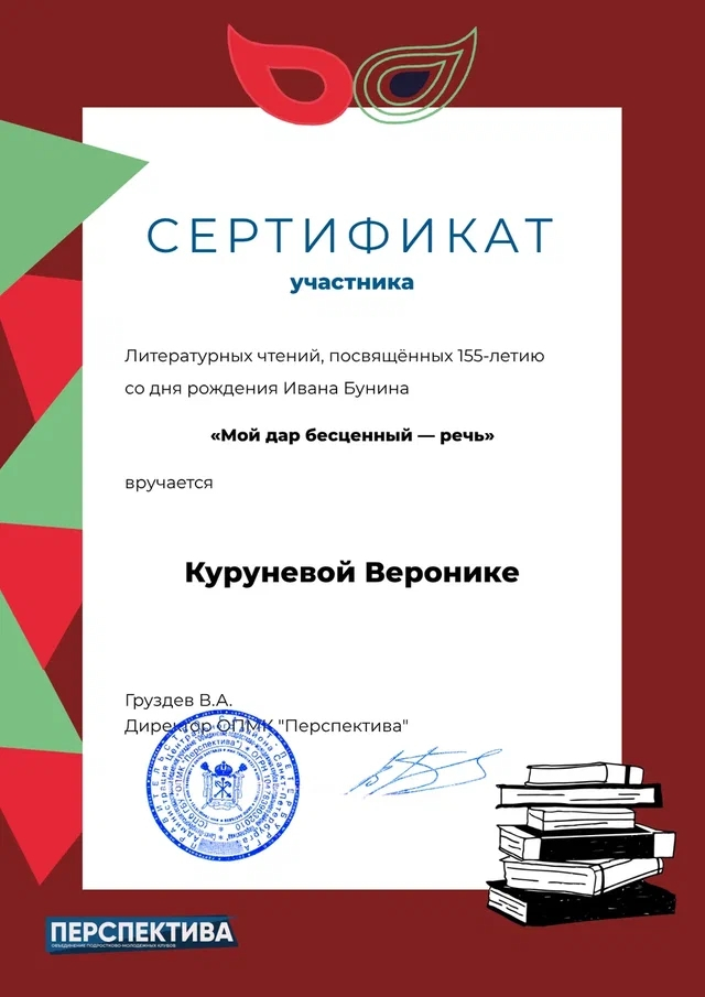 Хямяляйнен Елизавета (К1492), Борискина Эвелина, Курунова Вероника (К1596) приняли активное участие в двух мероприятиях, организованных ОПМК «Перспектива»: литературные чтения «Отговорила роща золотая», посвященные 130-летию со дня рождения С.А. Есенина, и «Мой дар бесценный - речь…», посвященные 155-летию со дня рождения И.А. Бунина.