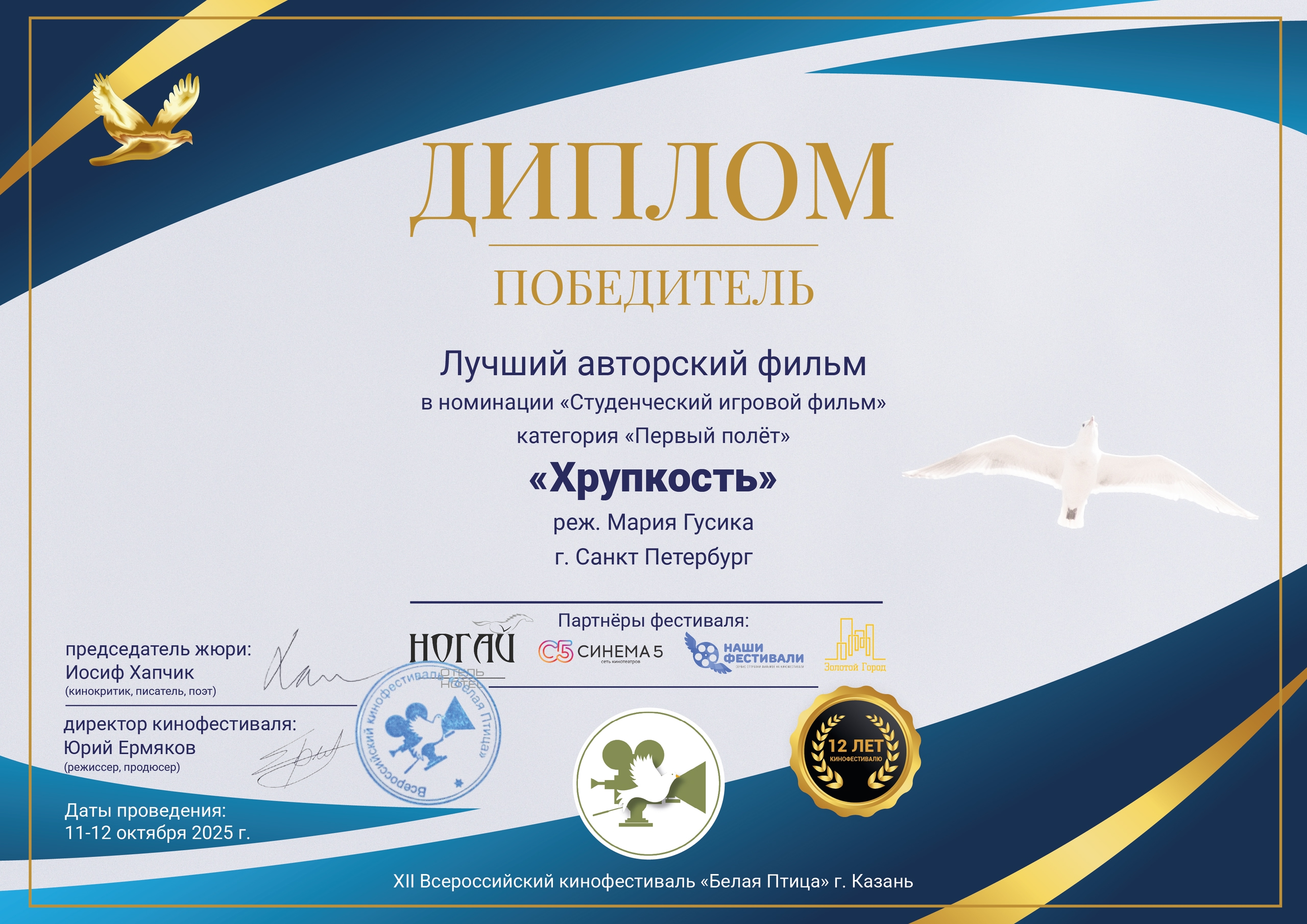 Фильм «Хрупкость» режиссёра Марии Гусики, мастерская Антона Сиверса и Татьяны Мельниковой, получил приз "Лучший авторский фильм"!