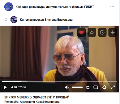 В группе ВК Кафедры режиссуры документального фильма опубликован фильм Анастасии Корабельниковой «Виктор Мережко. Здравствуй и прощай». Биографический фильм – интервью посвящён жизни и творческому пути известного сценариста и режиссёра Виктора Ивановича Мережко.