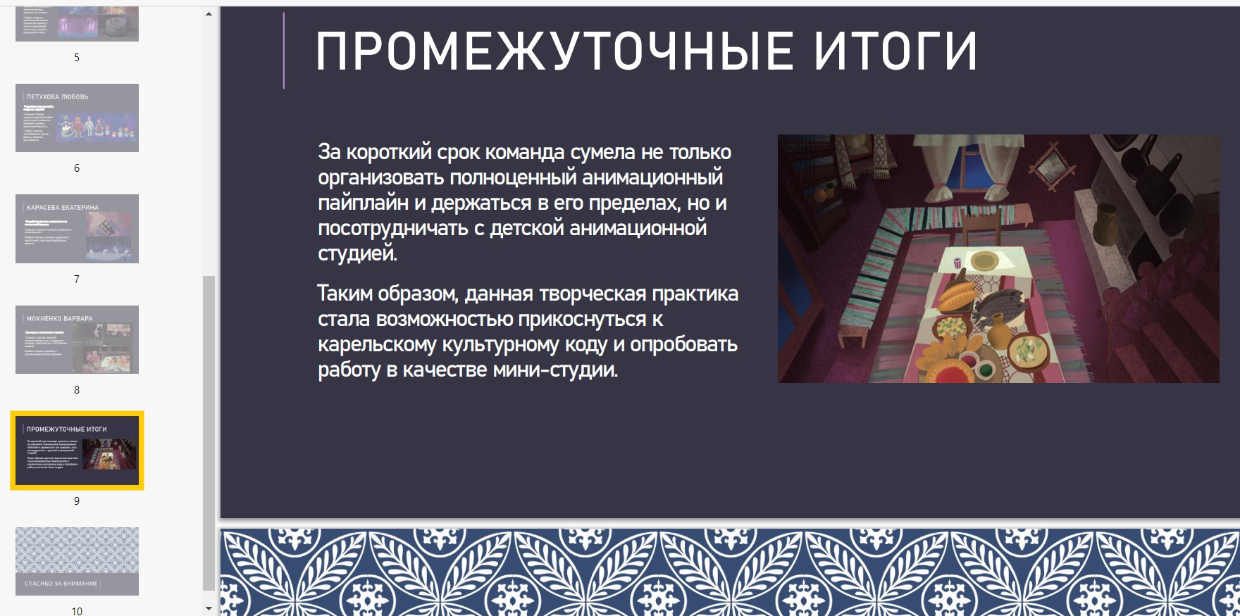 В ходе практики студенты, совместно с учащимися арт-студии «Домик Света», создали два анимационных фильма по мотивам карельских народных сказок: «Веселый Матти» и «Несолоно нахлебавшись», которые будут представлены во внеконкурсной программе IV Всероссийского детского анимационного фестиваля-конкурса «Золотое перышко» (28-30 октября 2025 г.). Анимационные проекты создавали студенты группы 1367б под руководством и консультированием преподавателей кафедры анимации и медиадизайна Оксаны Еремеевой и Эльвиры Гизатуллиной.