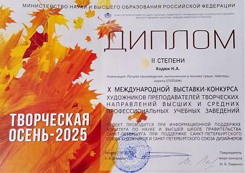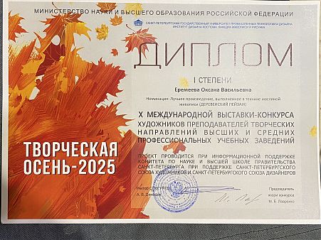 Десятая международная выставка-конкурс художников-преподавателей творческих направлений высших и средних профессиональных учебных заведений «Творческая осень-2025» прошла на базе Санкт-Петербургского государственного университета промышленных технологий и дизайна с 24 по 30 октября 2025 года.