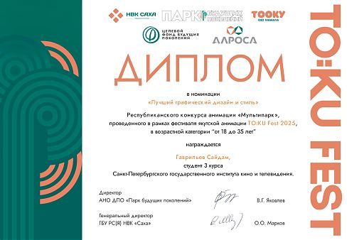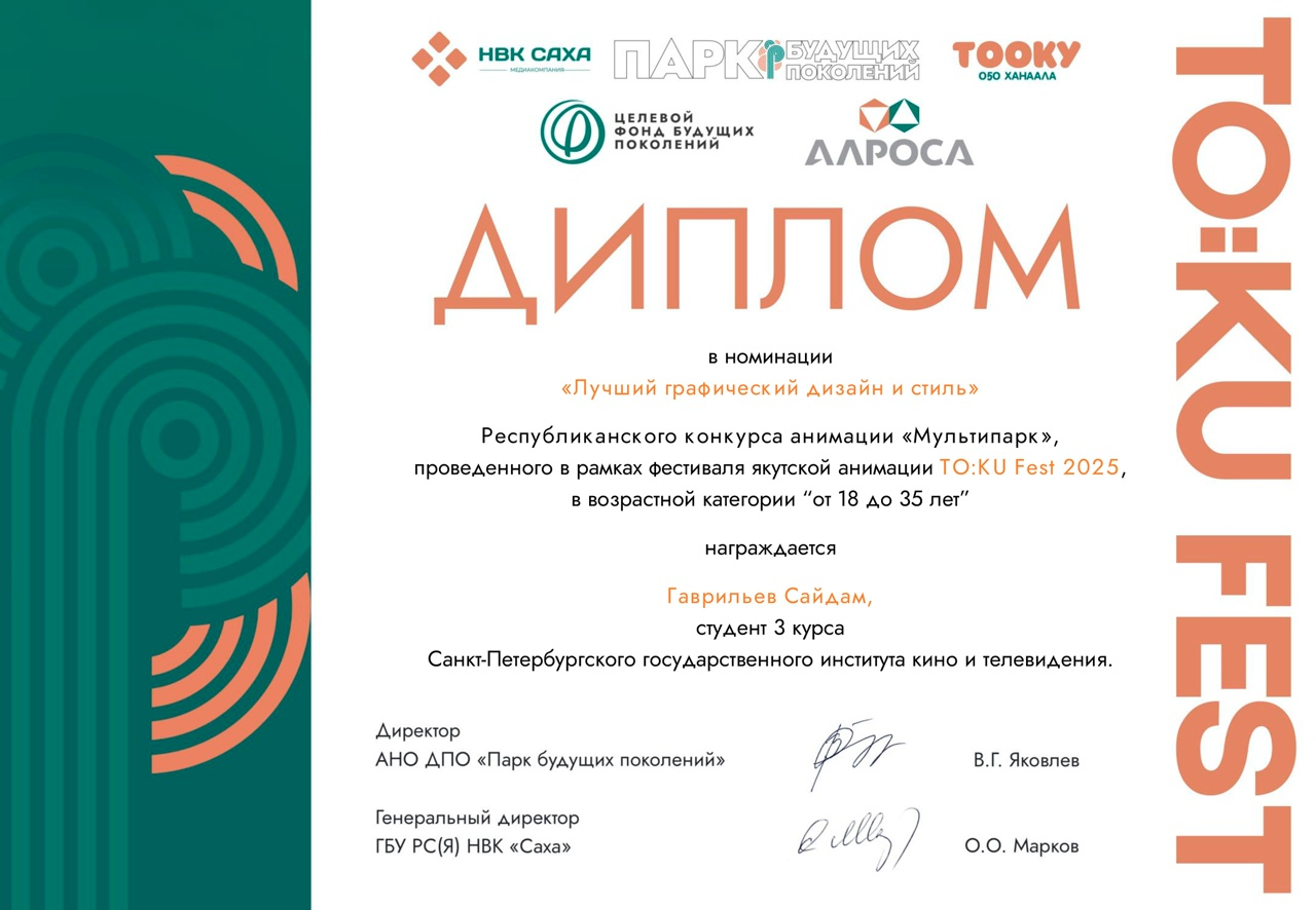 "Мультипарк" является одним из центральных событий фестиваля якутской анимации TO:KU FEST. Финалисты конкурса представили свои работы на очном этапе, который прошел в кластере "Квартал труда". Парк будущих поколений, флагманский проект Целевого фонда будущих поколений при поддержке АЛРОСА, активно развивает креативные индустрии, организуя множество мероприятий для детей и молодежи. В этом году в конкурсе приняло участие большое количество талантливых ребят, 30 из которых вышли в финал. Сайдам Гаврильев, студент третьего курса группы 1367а, кафедры компьютерной графики, Санкт-Петербургского государственного института кино и телевидения, уже во второй раз участвует в "Мультипарке" и специально приехал в Якутск, чтобы представить свой новый проект. Мы поздравляем Сайдама с победой и надеемся, что этот опыт станет для него не только ценной творческой школой, но и поможет определиться с будущей профессией и найти дело всей жизни!