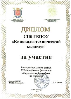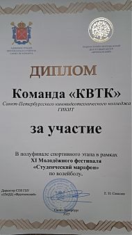 Студенты 1–4 курсов Санкт-Петербургского Киновидеотехнического колледжа СПбГИКиТ в период с 10 - 20.10.25 приняли активное участие в спортивном этапе 11-го молодежного Фестиваля «СТУДЕНЧЕСКИЙ МАРАФОН-2025» учебных учреждений СПО и ВО Фрунзенского района Санкт-Петербурга. Программа этапа состояла из соревнований по волейболу, плаванию, настольному теннису, пулевой стрельбе. Особо надо отметить успешное выступление наших студентов: Захарчук Полины, Ладилова Саввы, Тимохова Матвея, Расина Семена и Некрасова Максимилиана в соревнованиях по стрельбе, занявших 2 командное место, взявших Кубок и Серебряные медали в это виде спорта. Также наши сборные команды КВТК неплохо показали себя в соревнованиях по волейболу, заняв 5 место, настольному теннису и плаванию. В спортивном этапе студенческого Марафона-2025 приняли участие 12 учебных учреждений СПО Фрунзенского района Санкт-Петербурга.