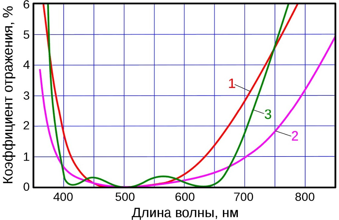 Спектральные характеристики коэффициента отражения разных трехслойных просветляющих покрытий