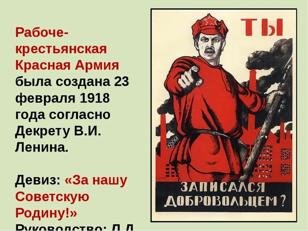 Гражданский праздник "День защитника Отечества" берет начало с 28 января (15 января по старому стилю) 1918 года. В этот день Совет народных комиссаров (фактическое правительство Советской России) во главе с председателем В.И. Лениным принял Декрет об организации Рабоче‑крестьянской Красной Армии.
