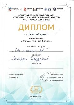 Студент 1 курса ГИКИТ Митрий Грудский триумфально заявил о себе в мире кинематографа, завоевав диплом "За лучший дебют в номинации документальные фильмы" на Международном кинофестивале «Свидание с Россией. Сибирский характер» имени Михаила Ульянова. Его фильм "Он помнит всё" – это дебютная работа молодого режиссера, выполненная под руководством мастеров Сергея Дебижева и Виктора Васильева.