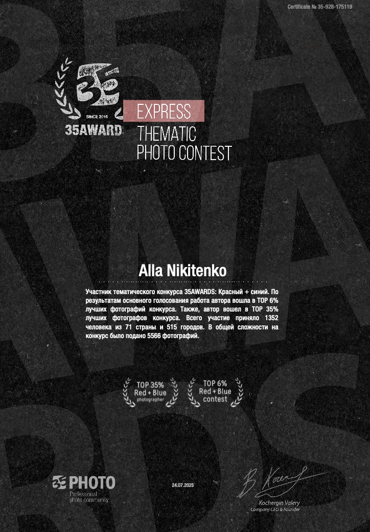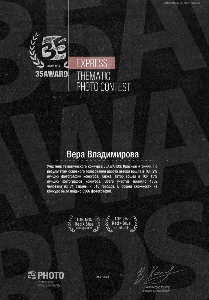 Вера Константиновна добилась выдающегося успеха в конкурсе «Красный+синий». Её фотография вошла в топ 2% лучших работ среди всех участников проекта, что подтверждает её высочайший профессиональный уровень. Итоги конкурса были подведены 24 июля 2025 года.