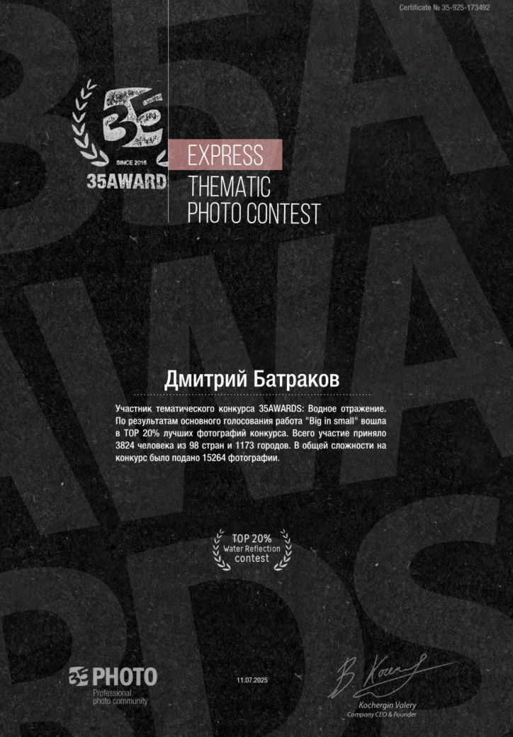 Дмитрий Евгеньевич также показал прекрасный результат: его работа прошла строгий отбор и вошла в топ 20% лучших снимков конкурса «Водное отражение». Итоги конкурса были подведены 11 июля 2025 года. Кроме того, ещё одна его работа в настоящее время участвует в конкурсе «Облака», и мы желаем Дмитрию Евгеньевичу очередной победы!
