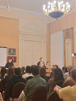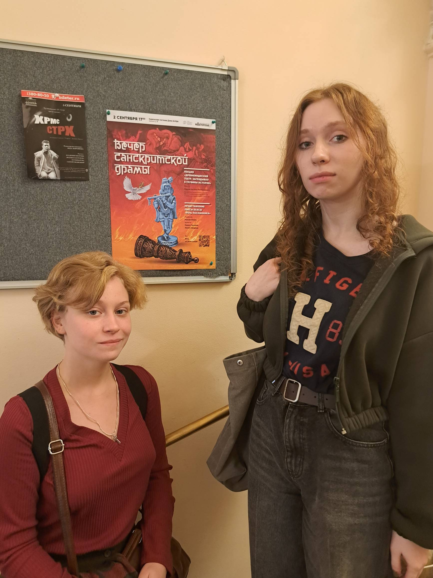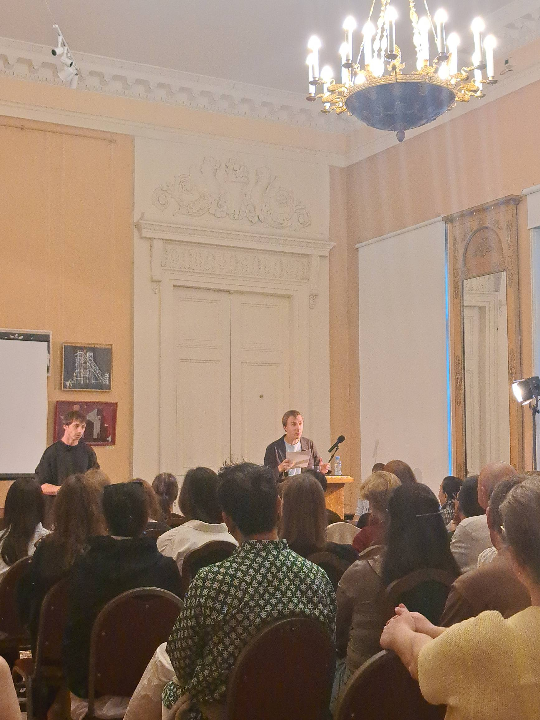 Уже первый вечер вторника студенты провели в Союзе театральных деятелей на Невском проспекте. Красивейшая Карельская гостиная собрала почти сотню зрителей, которые слушали лекцию специалистки по индийской драме из Москвы Натальи Ростиславовны Лидовой «Древнеиндийский театр. Заглядывая в глубины истории». Так для начинающих ученых открылась санскритская драма, древнейшие тексты в мировой культуре. После долгого и подробного рассказа о ритуалах, мифах, богах и танцах Древней Индии, зрители смогли увидеть читку фрагмента пьесы Бхасы, поставленную Максимом Фоминым и сыгранную актерами театра Мастерская.