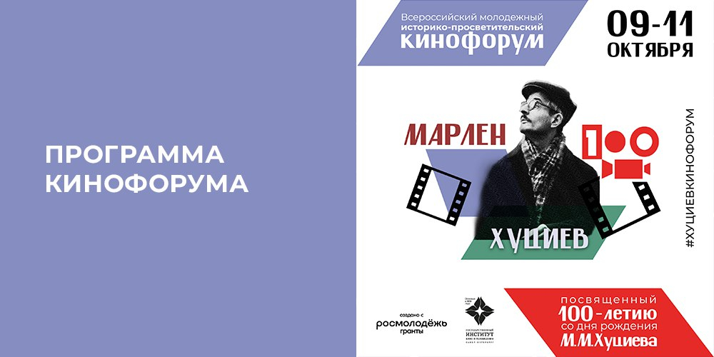 Проект «Всероссийский молодежный историко-просветительский кинофорум, посвященный 100-летию со дня рождения М.М. Хуциева» реализуется при поддержке Росмолодёжь.Гранты