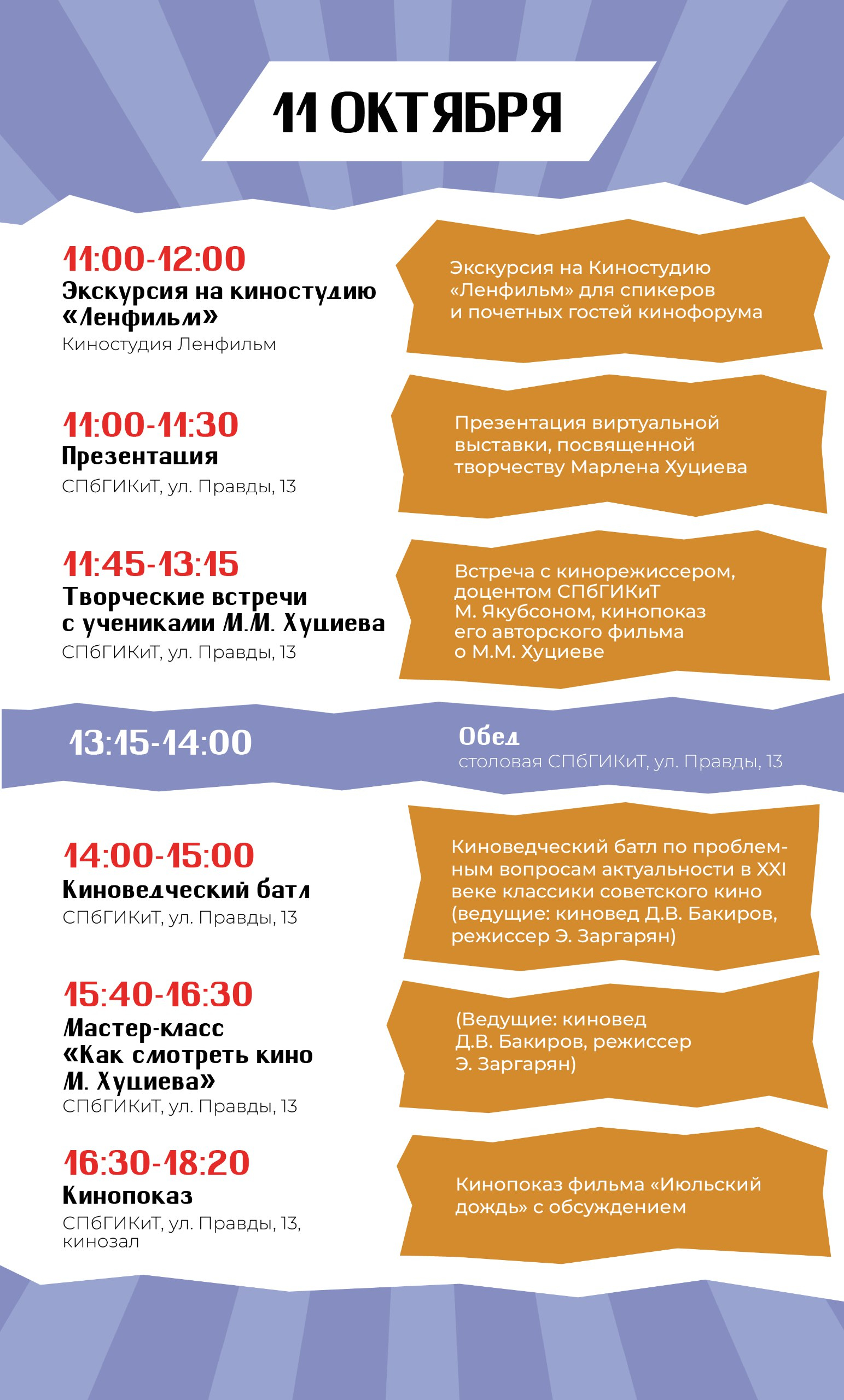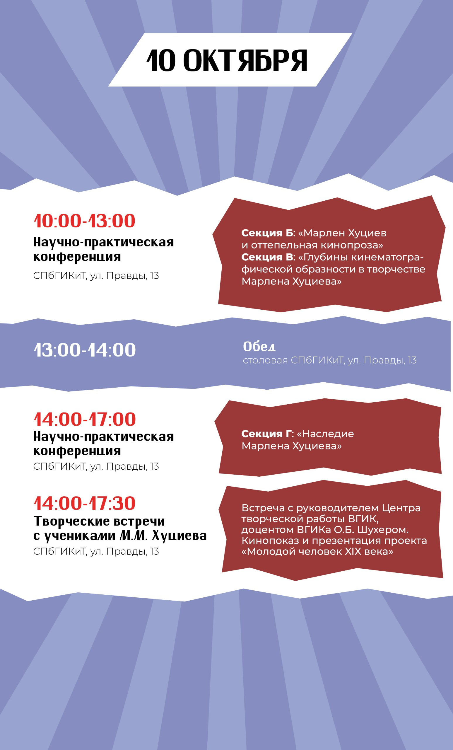 Мероприятие познакомит студентов и молодых кинематографистов с творческим наследием этого мастера. Спикеры форума ответят на вопросы о влиянии наследия Хуциева на развитие отечественного кинематографа. Во время встреч и научно-практических конференций участники смогут обсудить актуальные вопросы современной киноиндустрии.