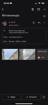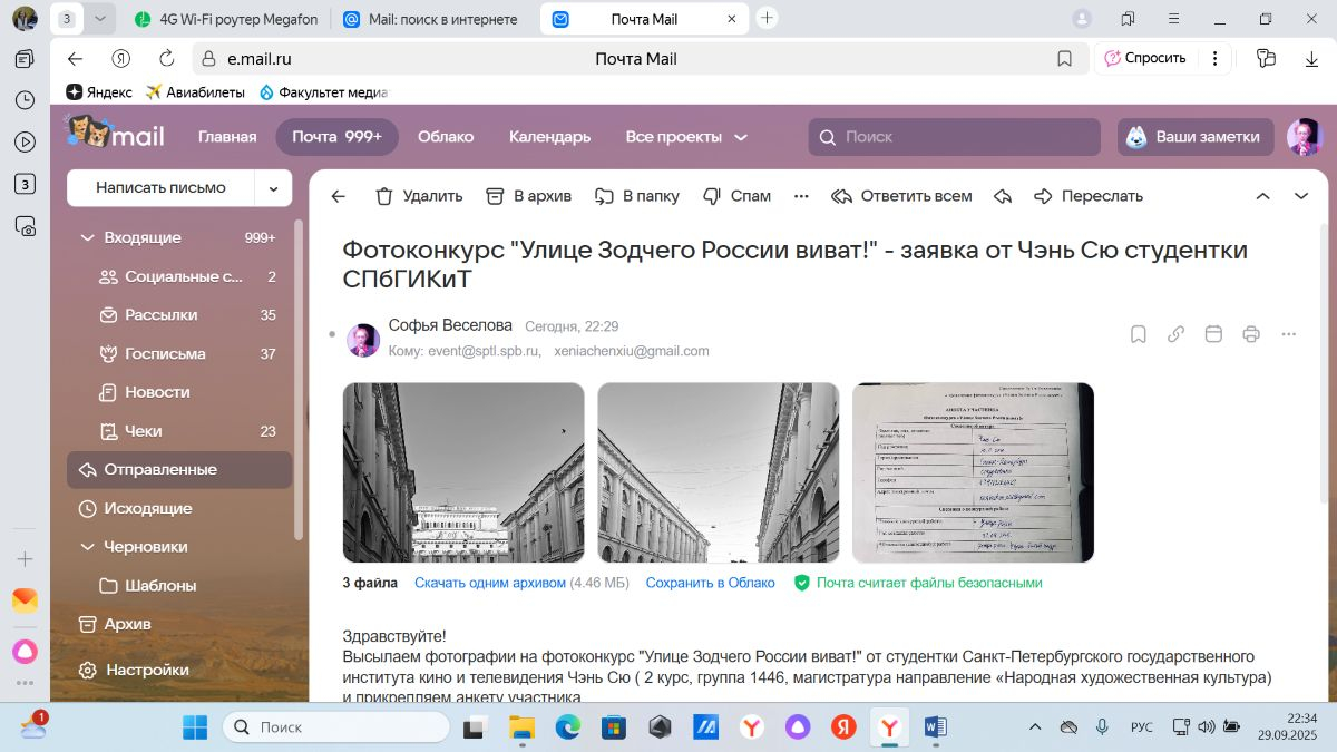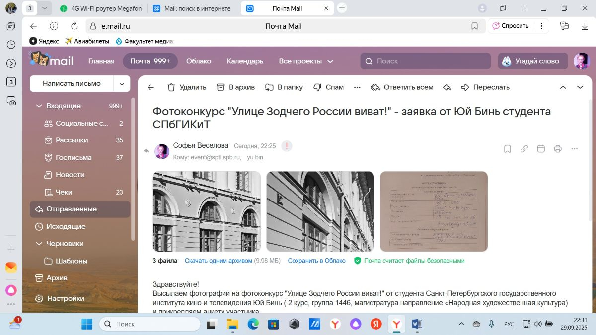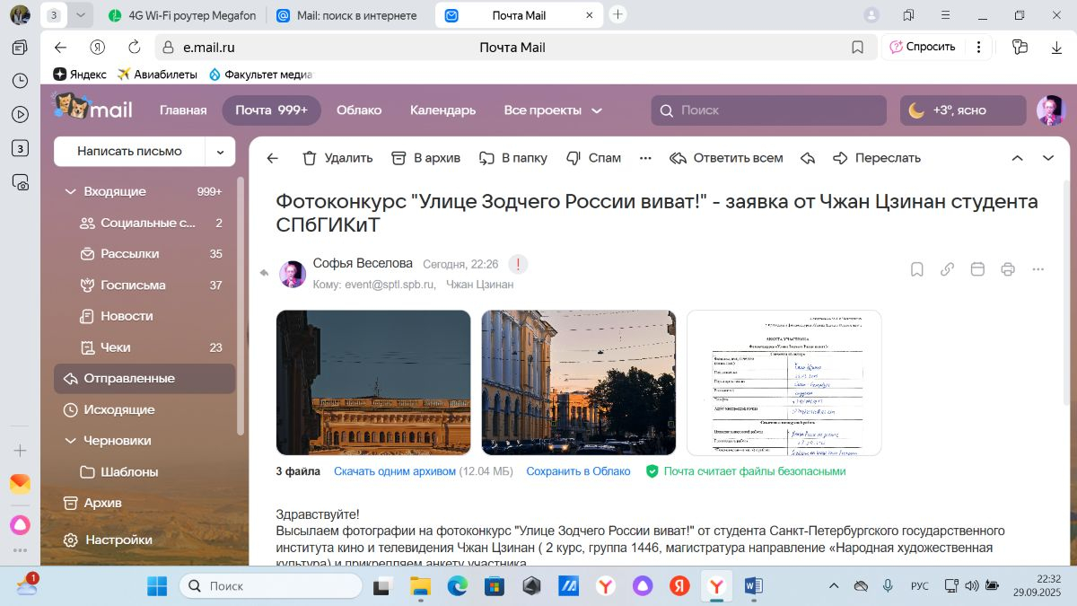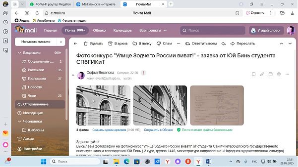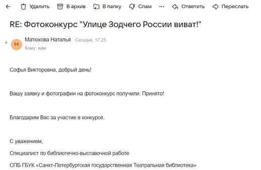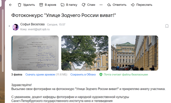 В период с 1 по 30 сентября 2025 года под руководством преподавателей: профессоров Кузнецова Ю.В. и Чезлова И.Г., доцентов Веселовой С.В., Леликовой Г.Ф. и Реш О.В. студенты кафедры фотографии и народной художественной культуры направления подготовки «Народная художественная культура» подали свои заявки и фотоработы для участия в фотоконкурсе «Улице Зодчего Росси виват!». Доцент Веселова С.В. также отправила свои фотографии на конкурс.