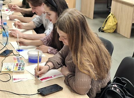 Лекцию дополнил практический мастер-класс под руководством доцента кафедры анимации и медиадизайна Оксаны Васильевны Еремеевой и доцента кафедры кинооператорского искусства Елены Юрьевны Патрикеевой. На практике студенты узнали о свойствах, составе и методах изготовления красок, а также об истории живописи и ярких примерах цитирования живописных полотен в кинофильмах; на практике познакомились с субтрактивным синтезом цвета, выполнив несколько упражнений по смешиванию красок, цветным заливкам и растяжкам цвета.