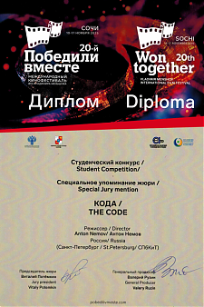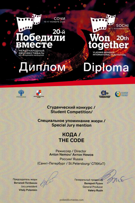 На Международном кинофестивале «Победили вместе» фильм Антона Немова «КОДА» (мастерская Сергея Дебижева и Виктора Васильева) в студенческом конкурсе удостоен диплома