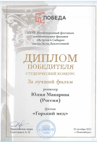 На Международном фестивале документальных фильмов "Встречи в Сибири" в номинации Студенческий конкурс - Диплом победителя - "За лучший фильм" получил фильм Юлии Макаровой «Горький мёд»