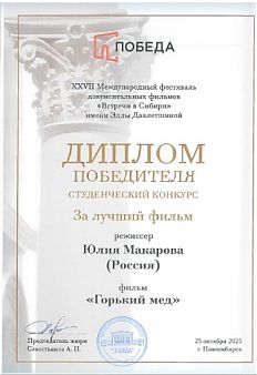Фильм Юлии Макаровой "Горький мёд" стал победителем фестиваля "Встречи в Сибири" в номинации "Студенческий фильм" - Диплом победителя "За лучший фильм"