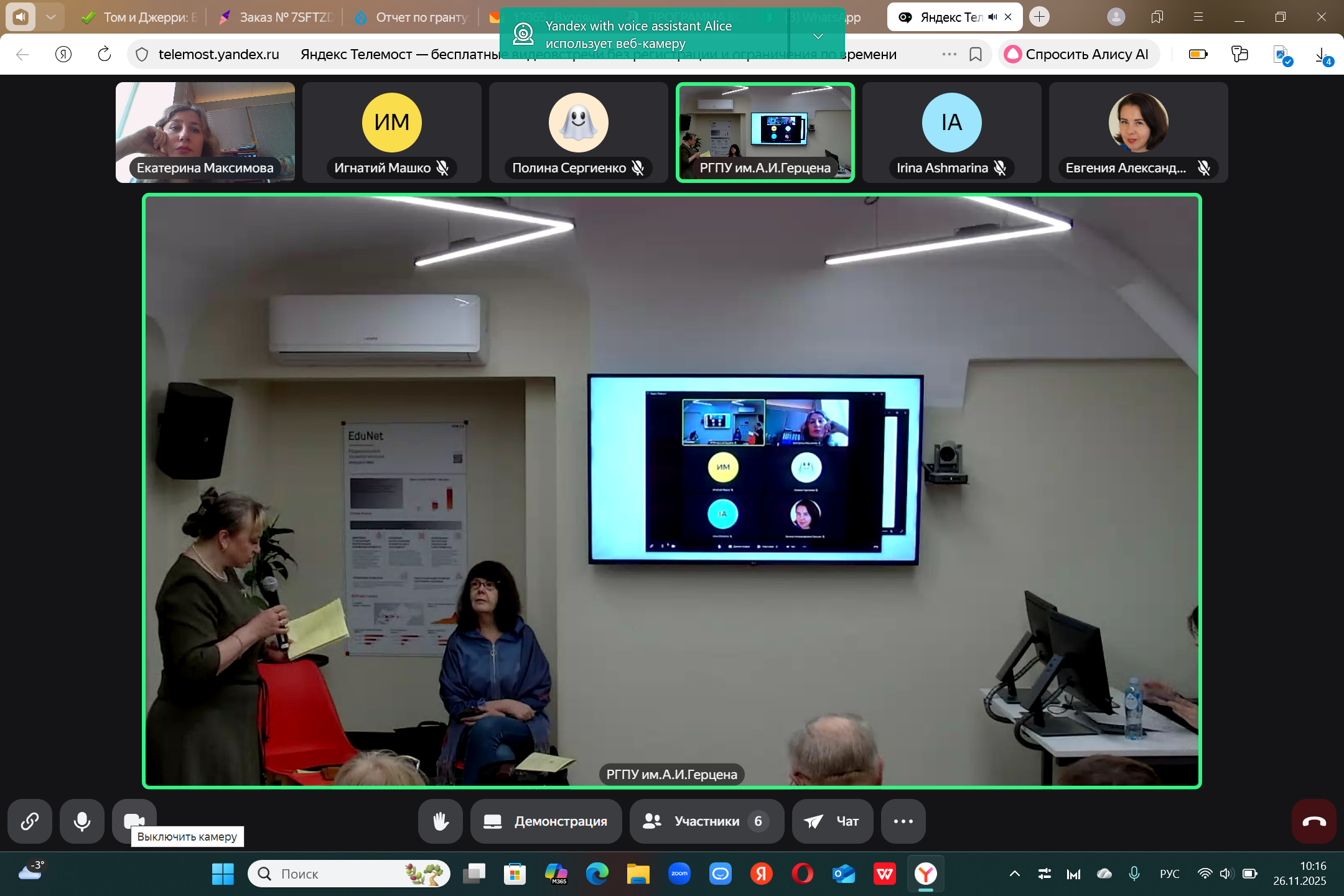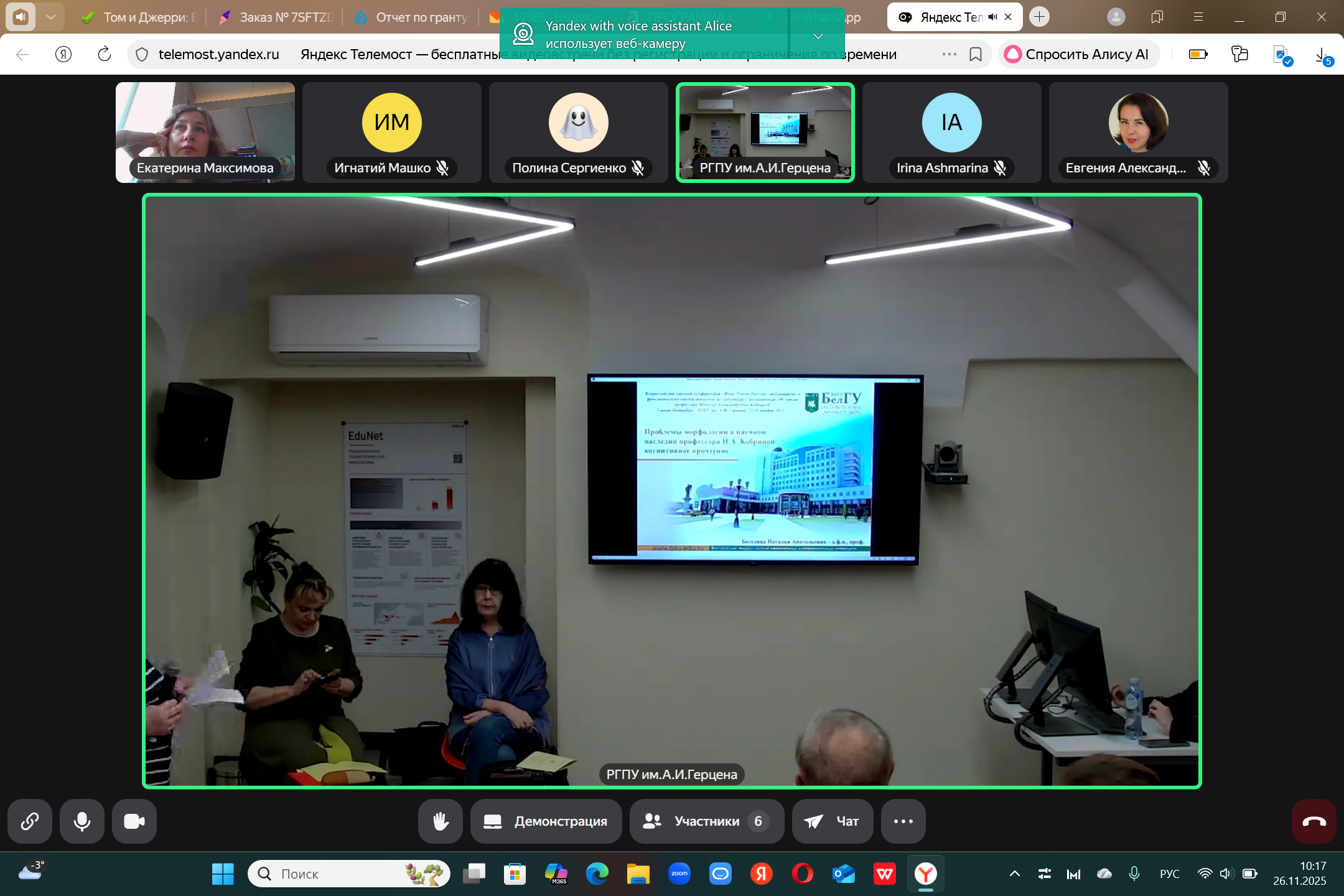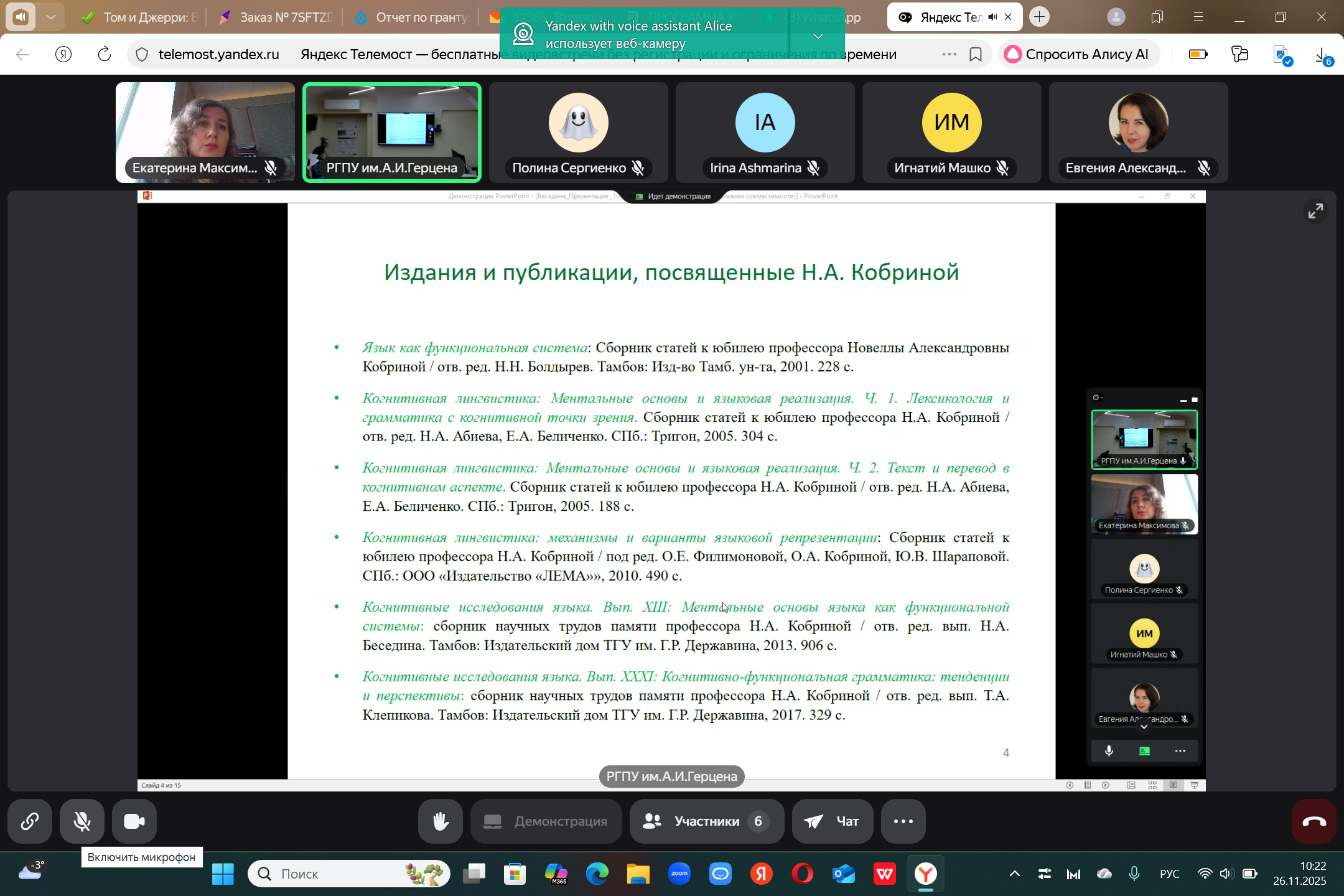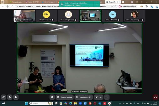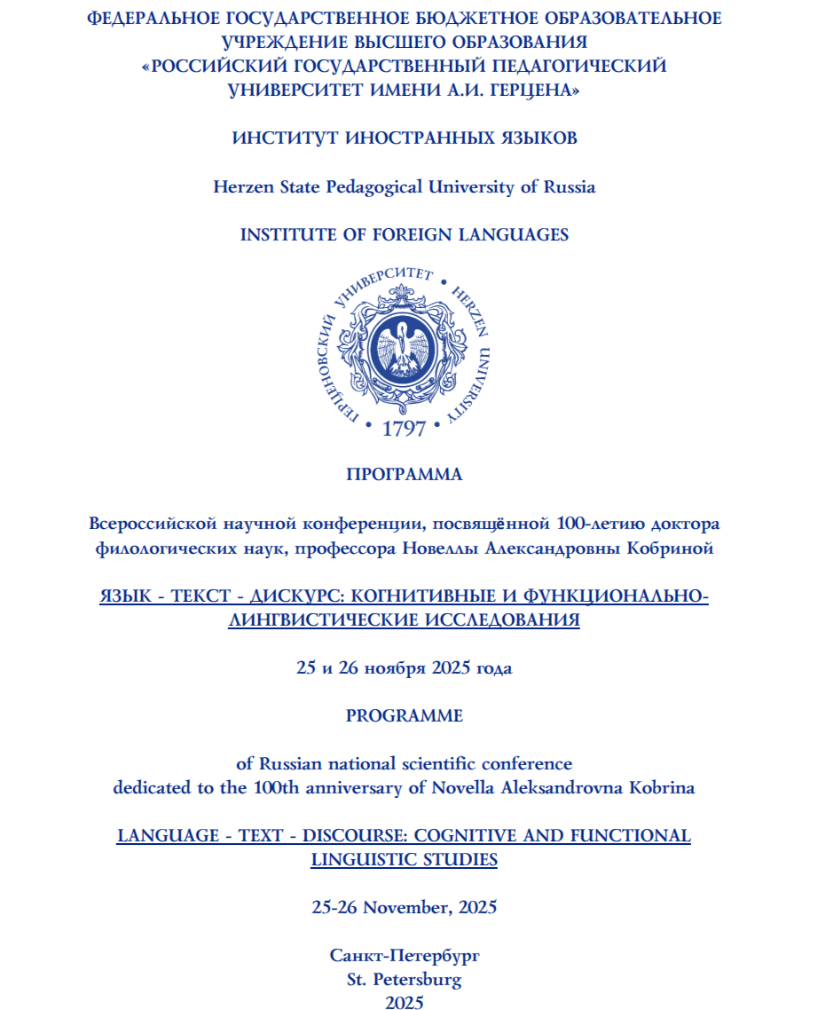 26.11.25 доцент кафедры иностранных языков, кандидат филологических наук Екатерина Евгеньевна Максимова выступила с докладом в Российском педагогическом университете им А.И. Герцена на Всероссийской конференции, посвящённой 100летию выдающегося ученого-лингвиста, профессора Новеллы Александровны Кобриной.