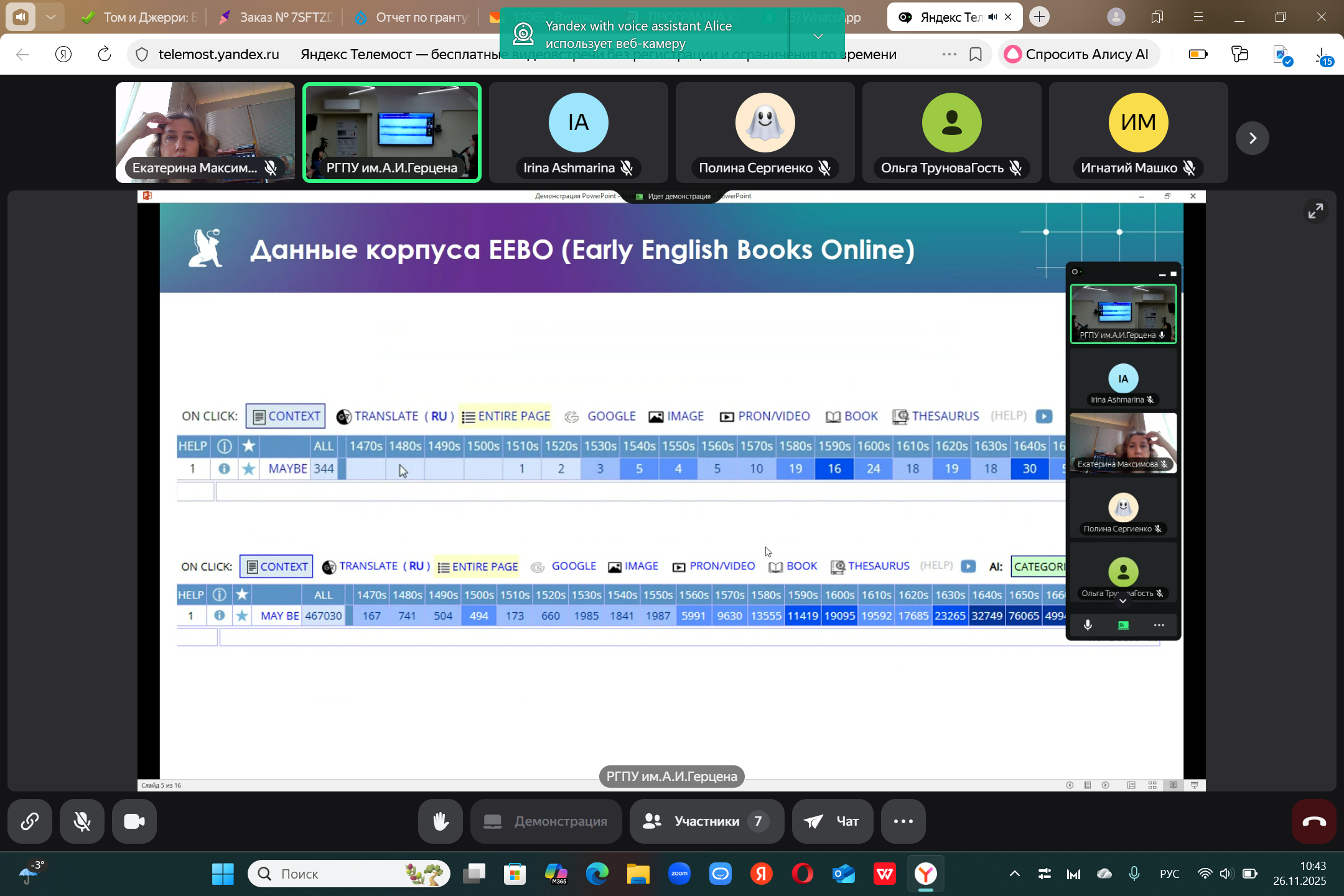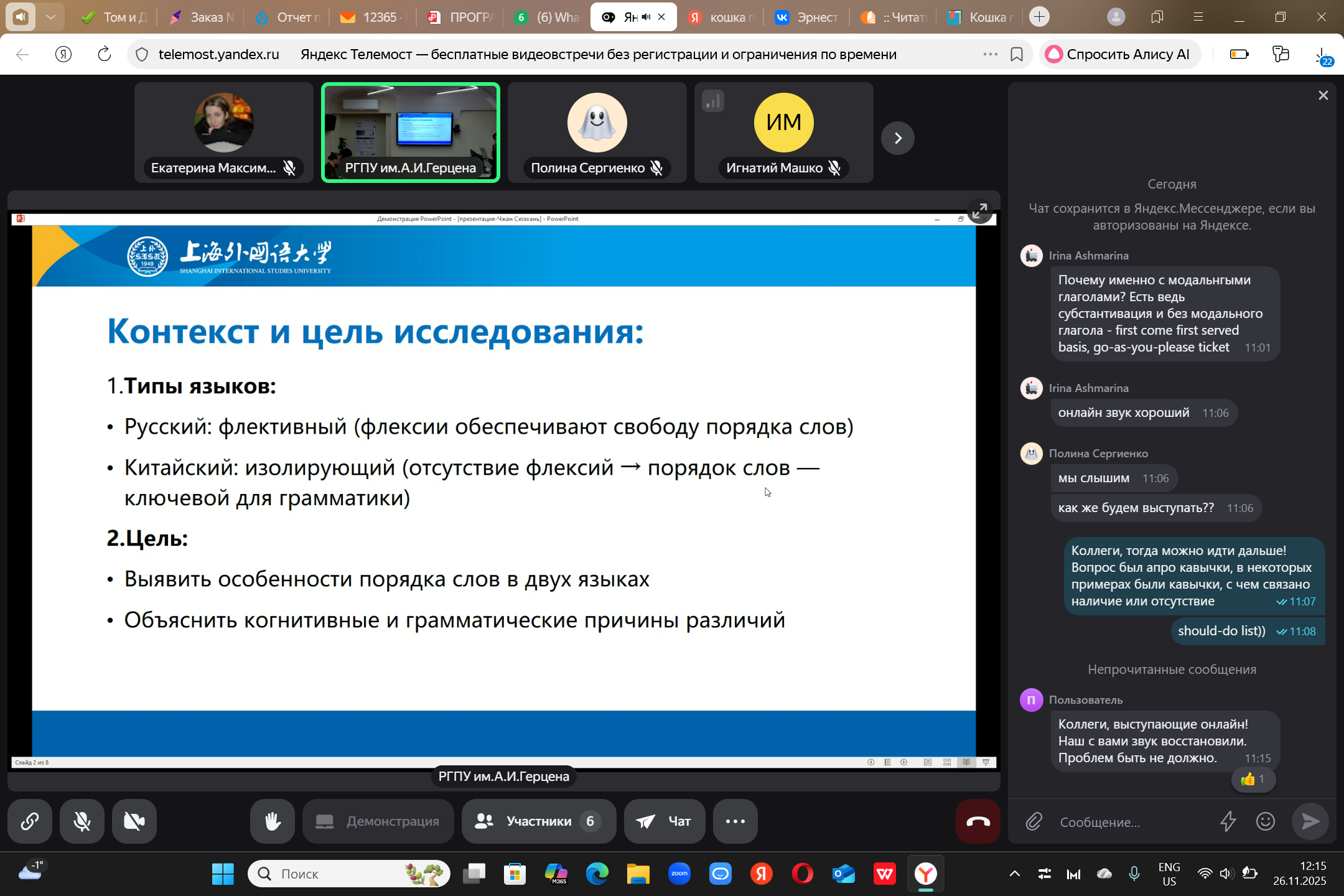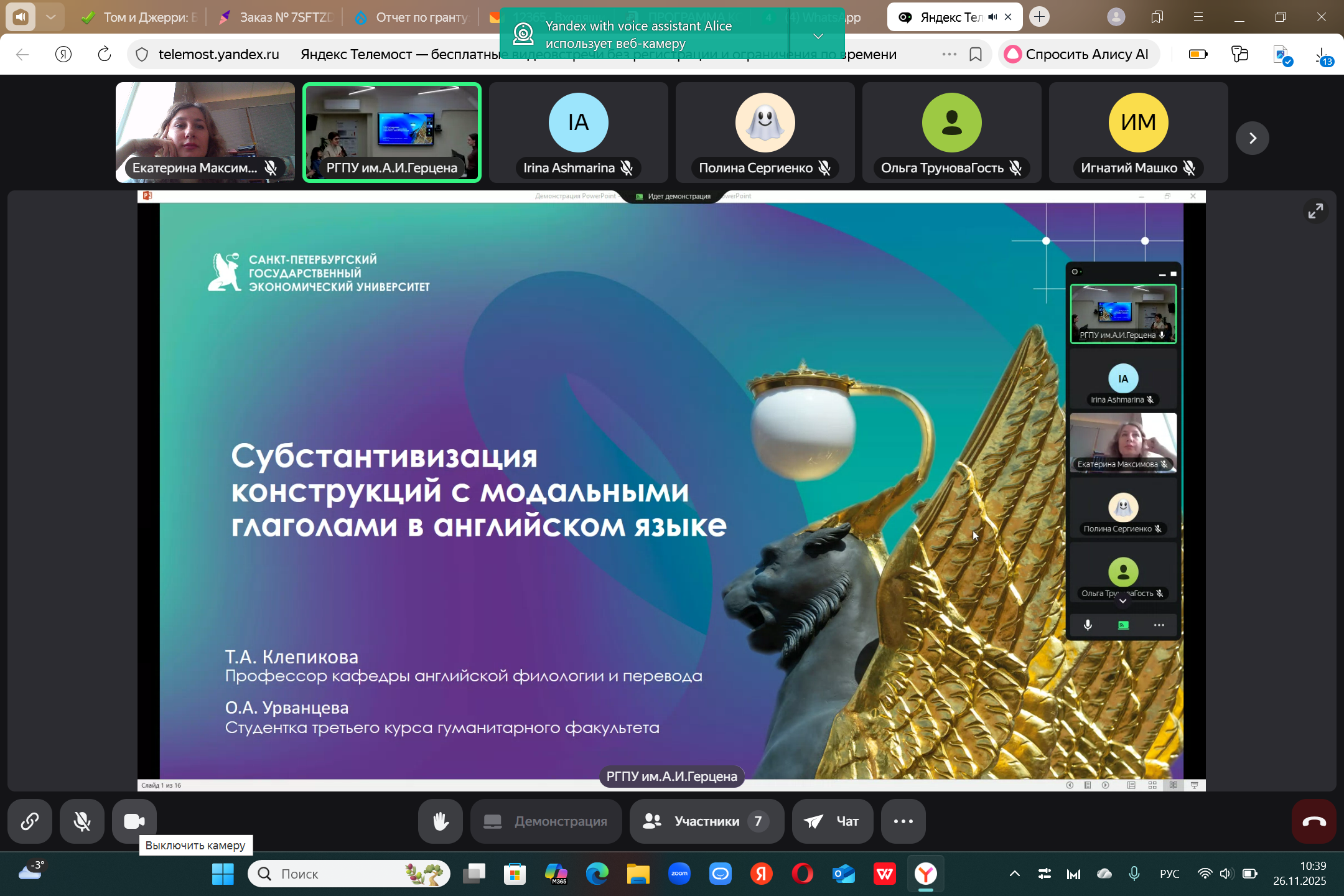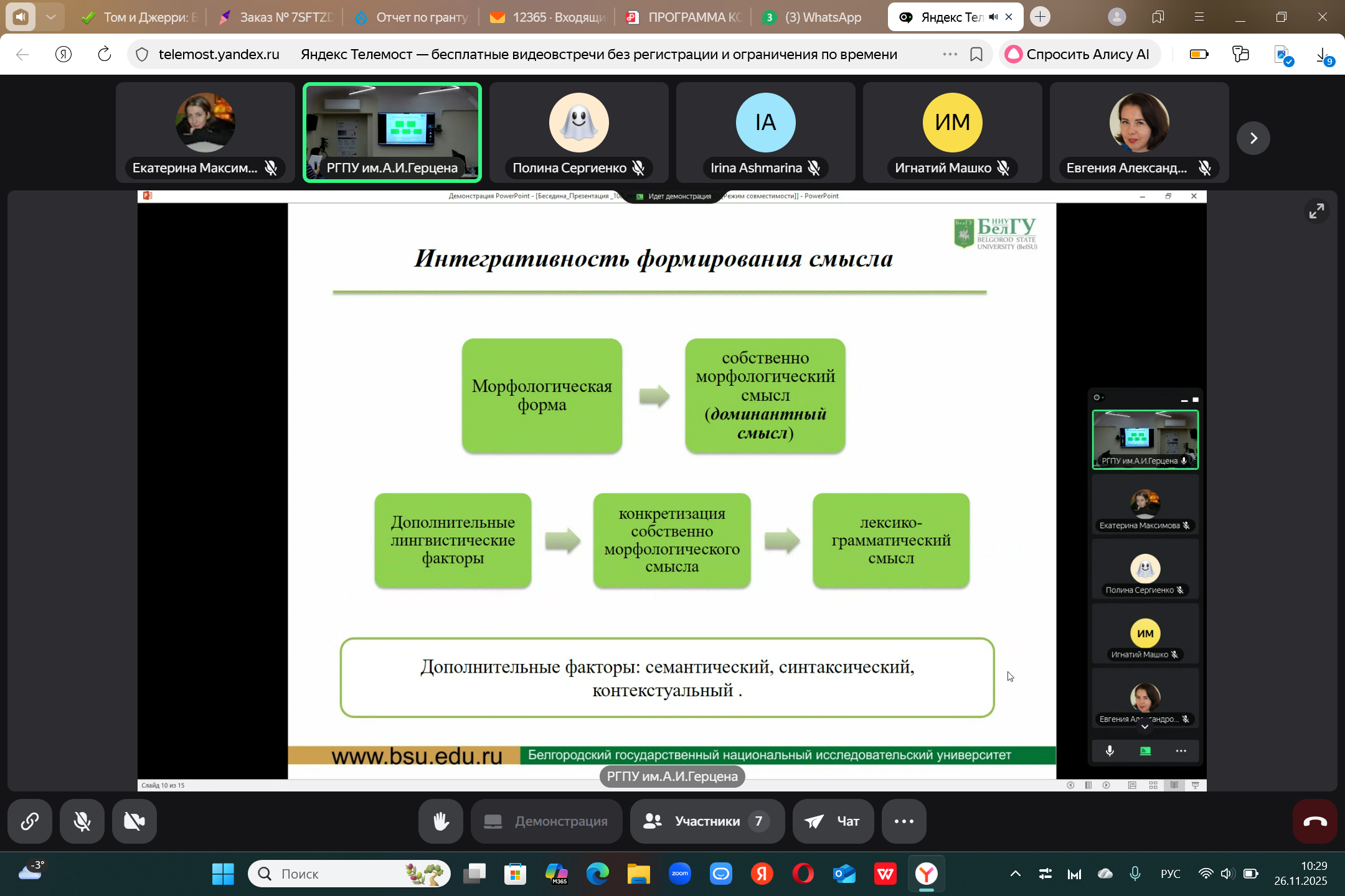26.11.25 доцент кафедры иностранных языков, кандидат филологических наук Екатерина Евгеньевна Максимова выступила с докладом в Российском педагогическом университете им А.И. Герцена на Всероссийской конференции, посвящённой 100летию выдающегося ученого-лингвиста, профессора Новеллы Александровны Кобриной. Мероприятие объединило учеников Новеллы Александровны из Москвы, Санкт-Петербурга, Белгорода, Тамбова и других городов, став площадкой для научных дискуссий по вопросам когнитивной лингвистики.
