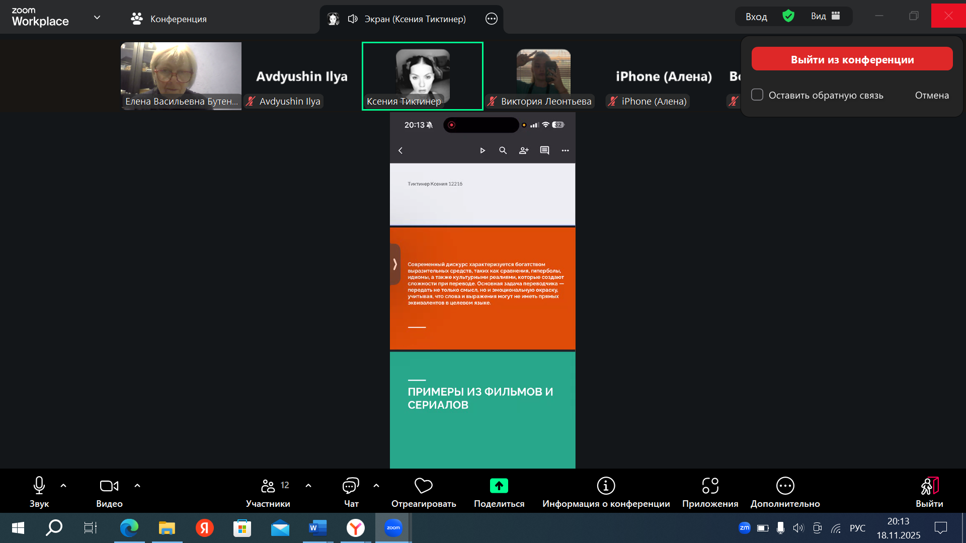 Предметом обсуждения онлайн-конференции, проведенной 22.10.2025 студентами группы 1221б, было использование единиц вторичной номинации и их дискурсивные функции.