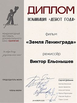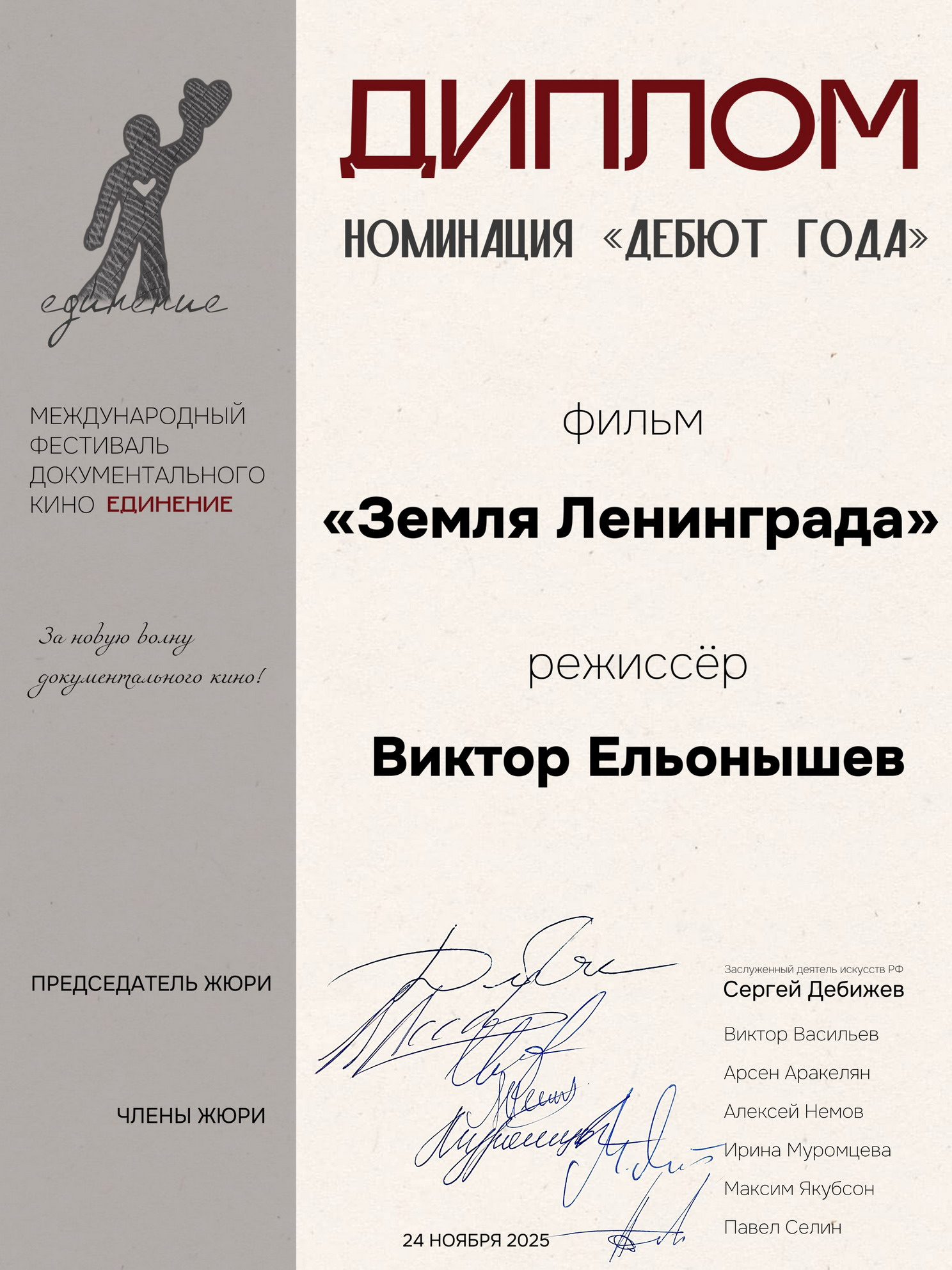 На Международном фестивале документального кино «ЕДИНЕНИЕ», проходившем в Воронеже», фильм Виктора Ельонышева «Земля Ленинграда» (мастерская Сергея Дебижева и Виктора Васильева) удостоен диплома в номинации «Дебют года».