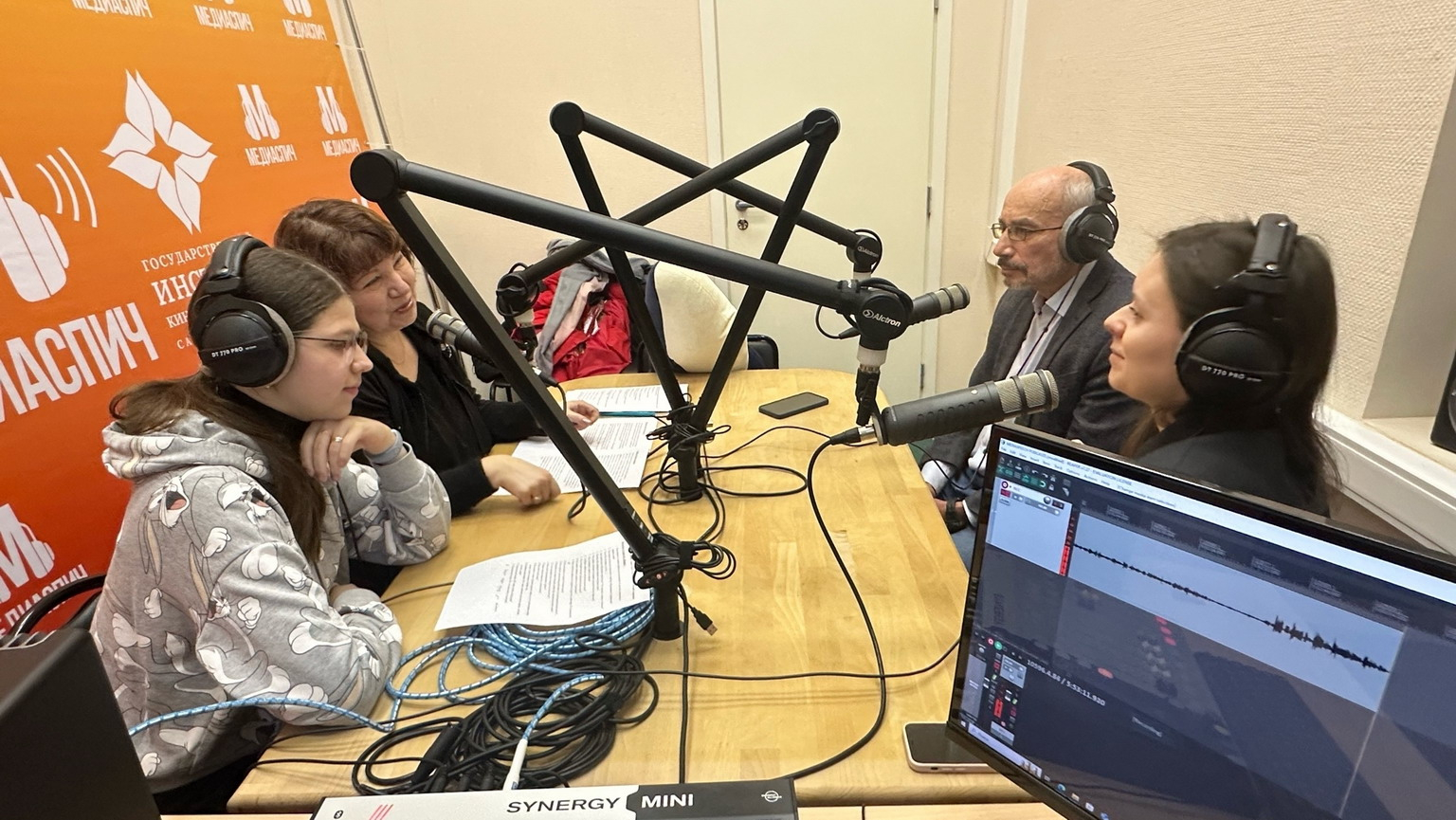 Выпуск подкаста вели основатель «Медиаспича», ведущая подкаста «Голос КИТа» Арина Маркова и Ксения Долматова, студентка 3-го курса мастерской режиссуры документального фильма.