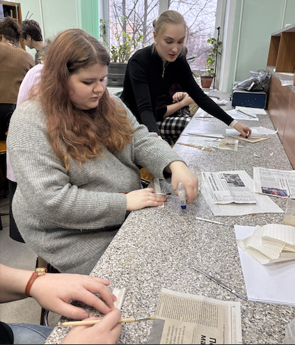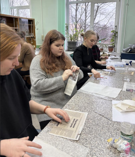 17 ноября состоялась творческая встреча, организованная преподавателями кафедры Мельниковой Е.А. и Соколовой Е.В. с младшим научным сотрудником лаборатории консервации и реставрации документов Санкт-Петербургского филиала Российской Академии наук Доронченковой Марией Андреевной для студентов гр.1439 кафедры фотографии и народной художественной культуры направления 54.03.04 «Реставрация» на тему: «Реставрация архивных газет». В ходе мероприятия Доронченкова М.А. познакомила студентов с различными типами реставрационных бумаг, применяемых для ликвидации механических дефектов, рассказала о специфике реставрации старых газет и провела мастер-класс о восполнении недостающих частей листа, технике укрепления газет – соединения разрывов без наслоения. Во время творческой встречи студенты провели самостоятельно реставрацию ветхих газетных листов с использованием микалентной и специальной реставрационной бумаги в два слоя в продольном и поперечном направлениях.