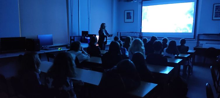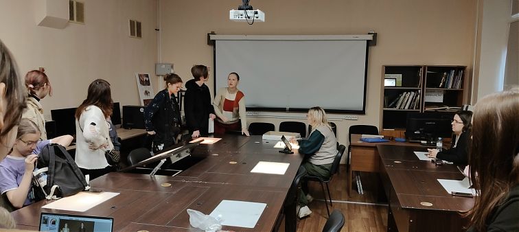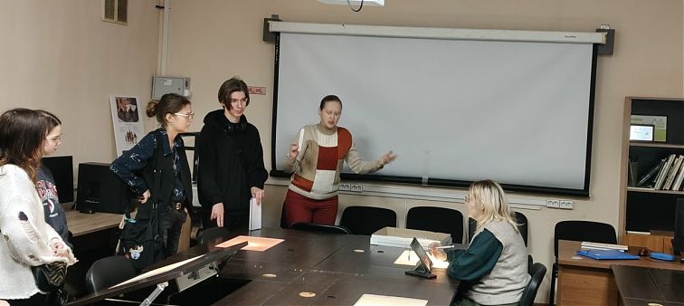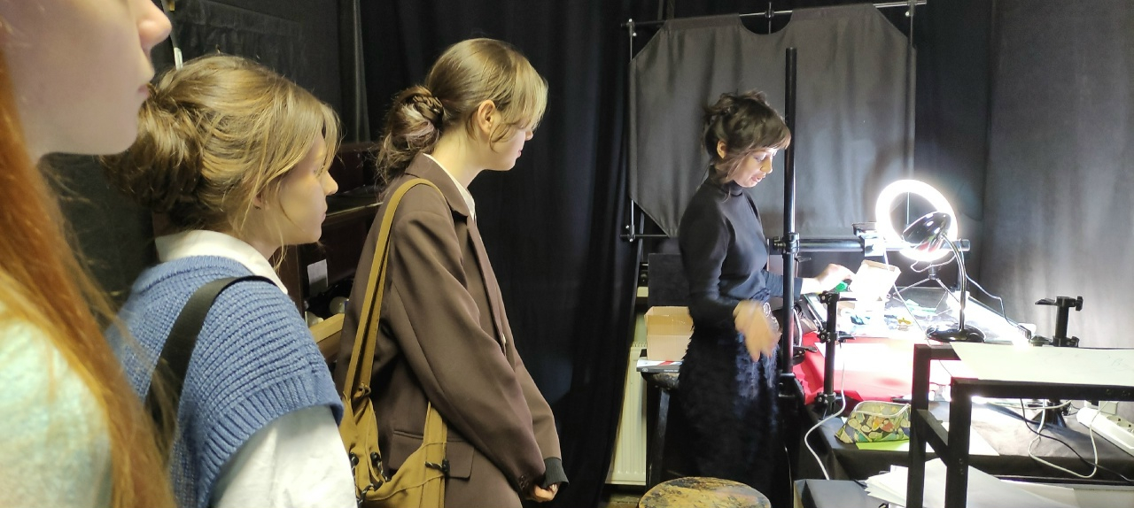 Особым моментом экскурсии стало знакомство с результатами плодотворного сотрудничества двух кафедр – актерского мастерства и компьютерной графики. Доцент Прокопьева М.В. представила первые материалы нового спектакля, над которым сейчас ведется работа, и рассказала о создании медиадекораций. Ребята стали первыми зрителями, увидевшими уникальные кадры, которые еще никто не видел.