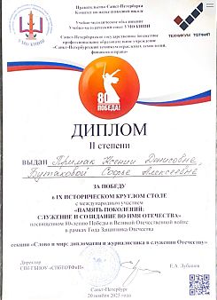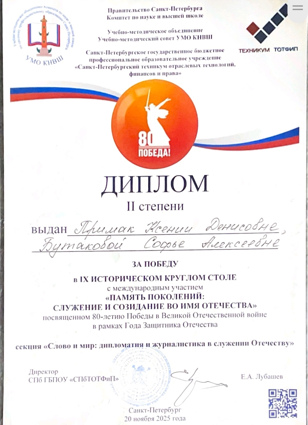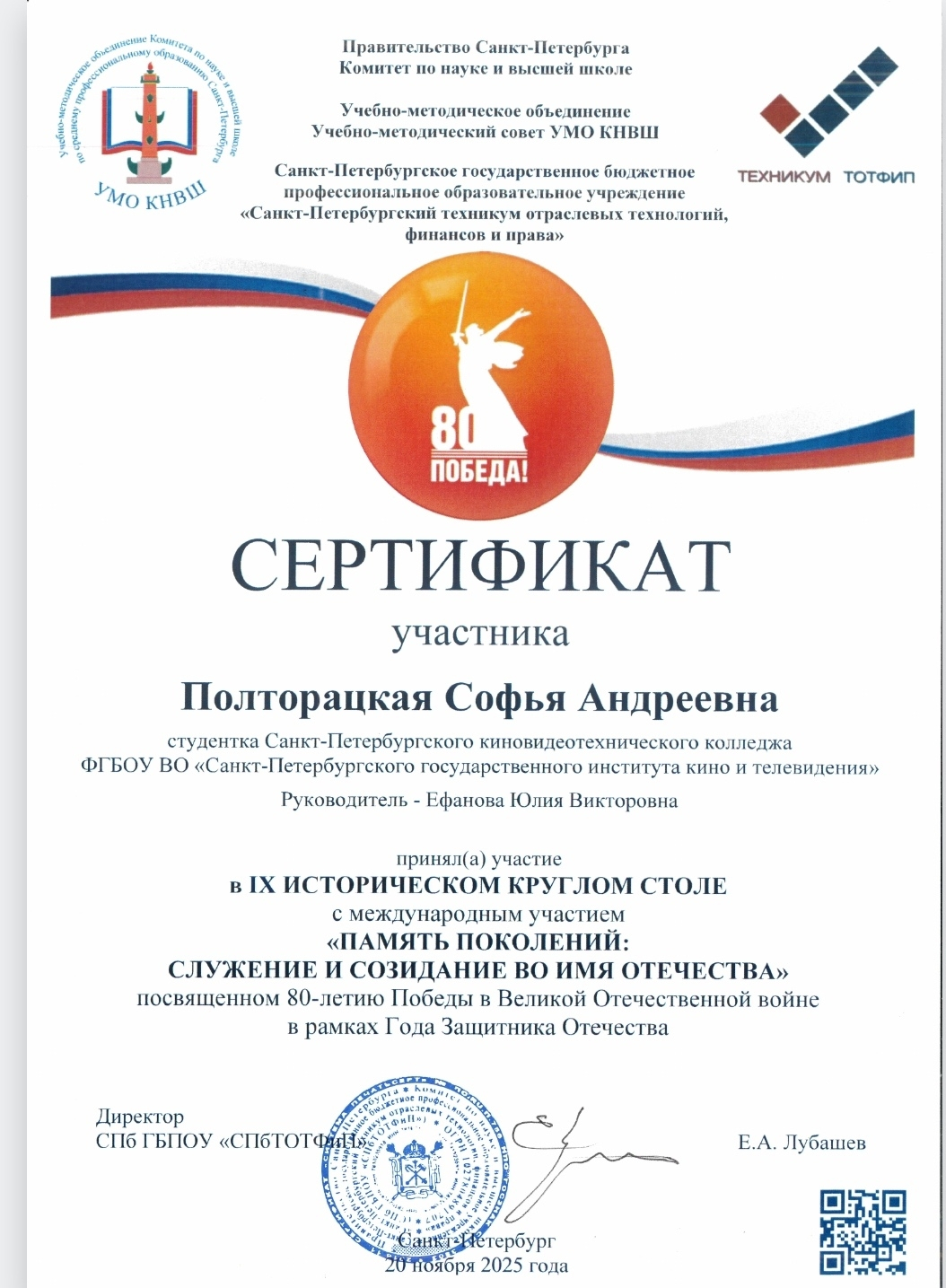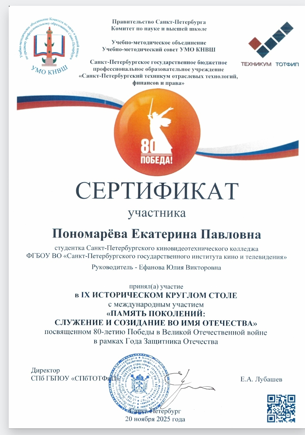 20 ноября 2025 года в Санкт-Петербургском техникуме отраслевых технологий, финансов и права прошел IX исторический круглый стол с международным участием «Память поколений: служение и созидание во имя Отечества», посвященный 80-летию Победы в Великой Отечественной войне в рамках Года Защитника Отечества.
