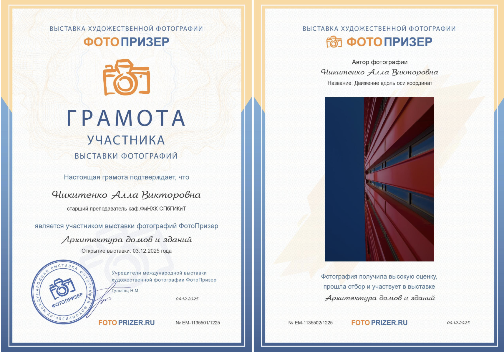 Старший преподаватель каф.ФиНХК А.В. Никитенко представила фотоснимок "Движение вдоль оси координат" на выставке "Архитектура домов и зданий" от Международной платформы "ФотоПризёр".