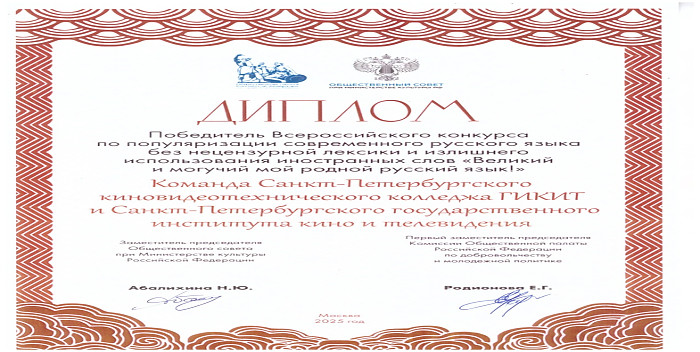 Команда СПбГИКиТ и КВТК стала Победителем Всероссийского конкурса по популяризации современного русского языка без нецензурной лексики и излишнего использования иностранных слов "Великий и могучий мой родной русский язык!"