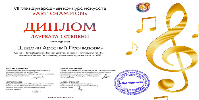 Студент Киновидеотехнического колледжа стал лауреатом VII Международного конкурса искусств "ART CHAMPION"!