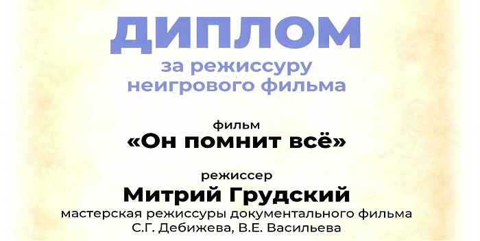 Фильм Митрия Грудского «Он помнит всё» (мастерская Сергея Дебижева и Виктора Васильева) удостоен диплома «За режиссуру неигровго фильма» 1-го этапа Международного фестиваля студенческих фильмов ПитерКИТ.