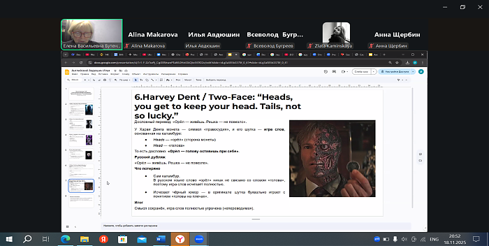 Предметом обсуждения онлайн-конференции, проведенной 18.11.2025 в группе 1221б, стала социально-культурная специфика современного дискурса и ее выражение в кинопереводе.